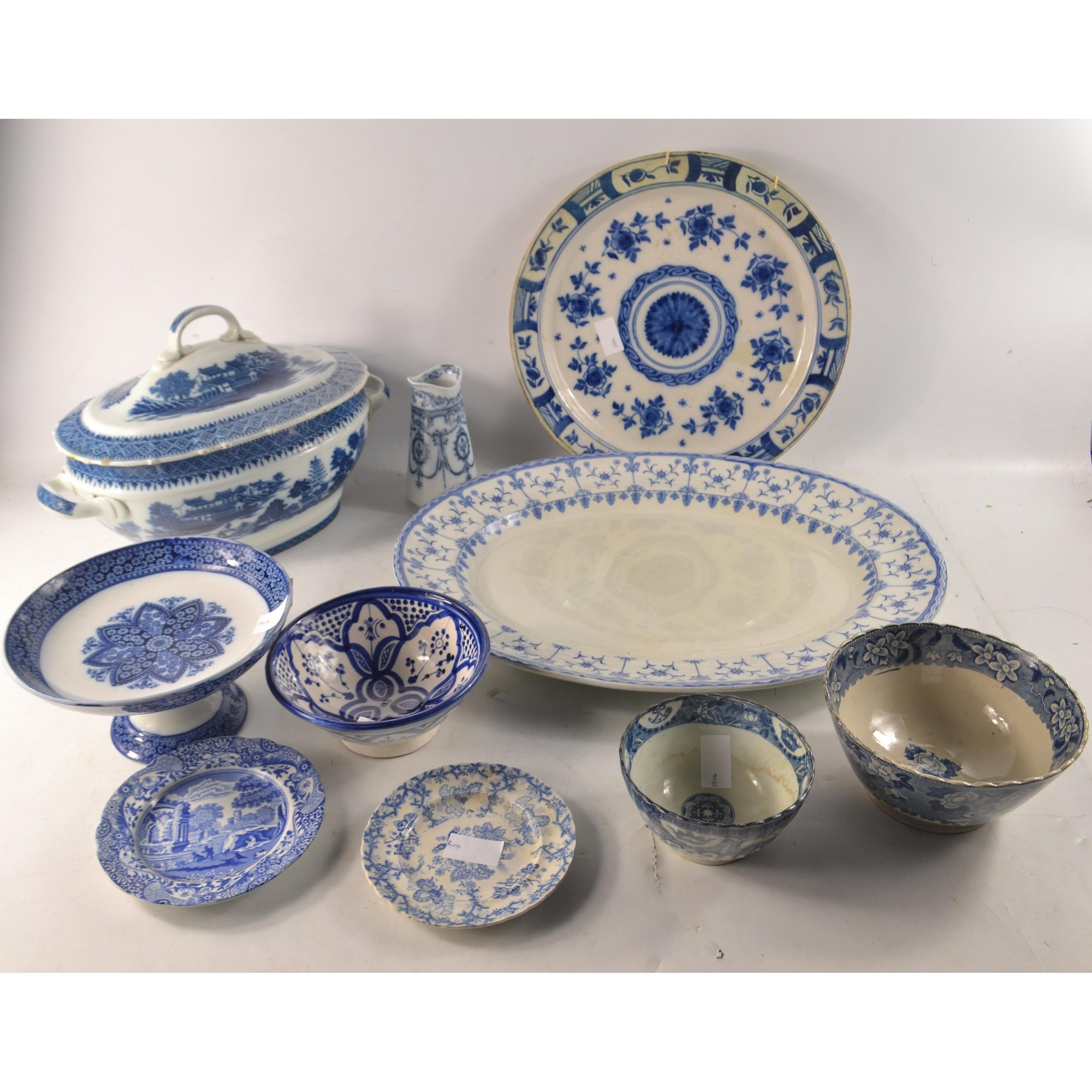 A large collection of blue and white ceramics to include SHERATON ADDERLEY COPELAND SPODE and a very large VINTAGE DOULTON MEAT SERVING OVAL PLATE 50cm length X 40cm width , an antique round decorative plate 35cm diameter, also a nice COPELAND comporte, also a really STUNNING SOUP Terenne ( damage repaired) and lid intact a few chips on the rim 30cm long x 26cm high And a few other pieces ( 12)to include a MADONS JUG and a large Wherst Japan vase with damage to the pouring spout 30 cm high