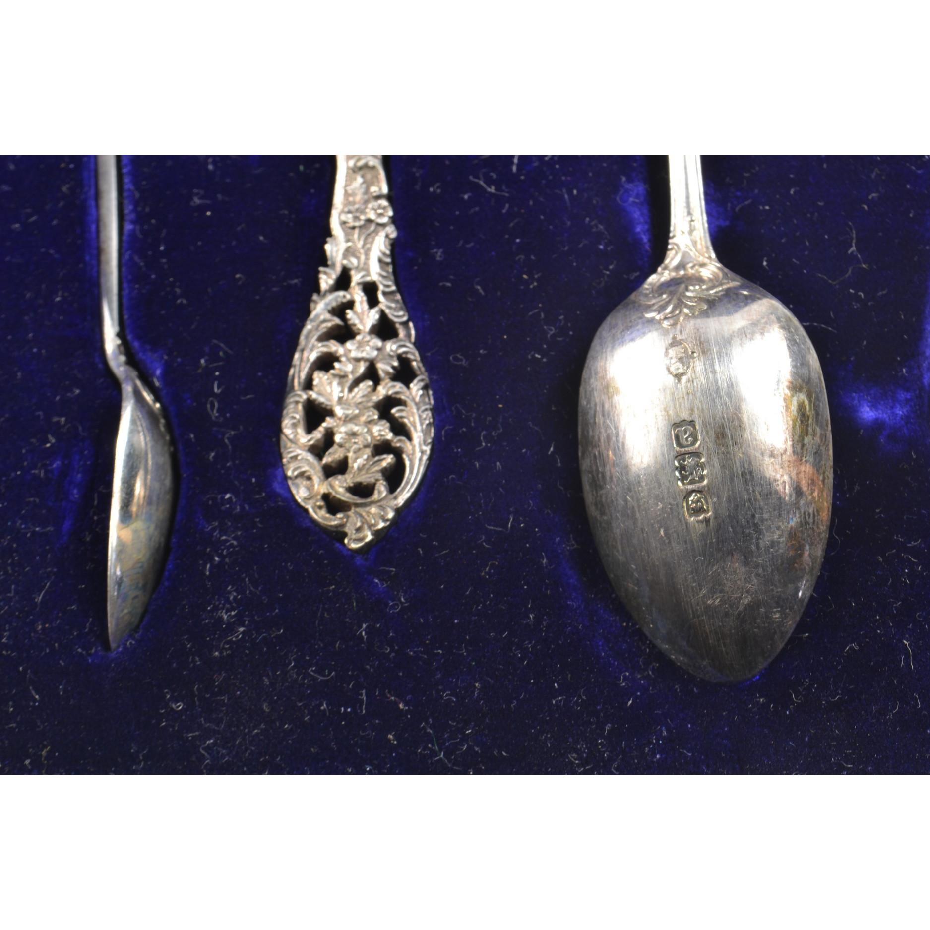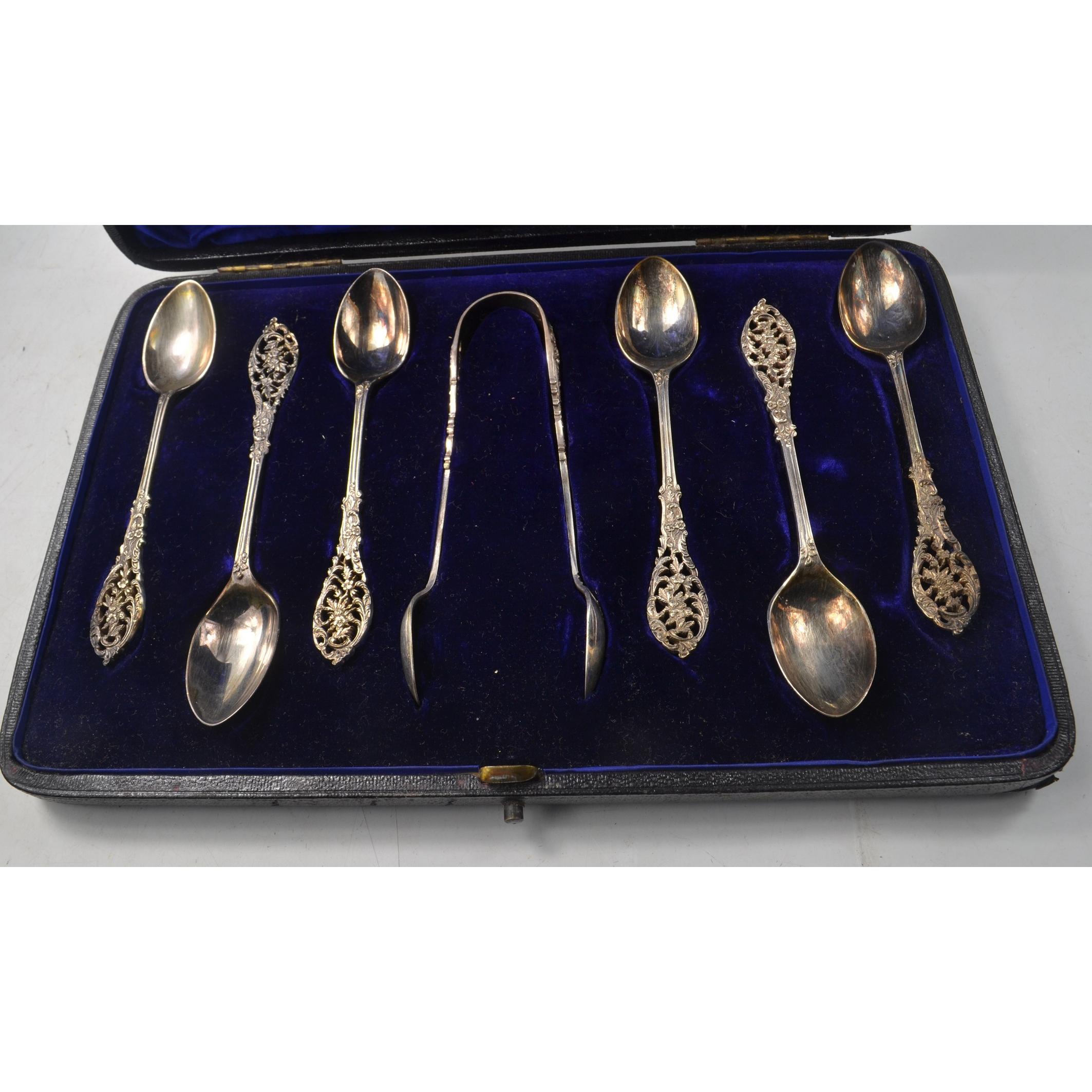 Canteen of Vintage Silver Hallmarked LONDON 1895 WC(William Cripps, London) six tea spoons with a set of tongs beautifully craftedGross weight approx 115gApprox 8 pieces
