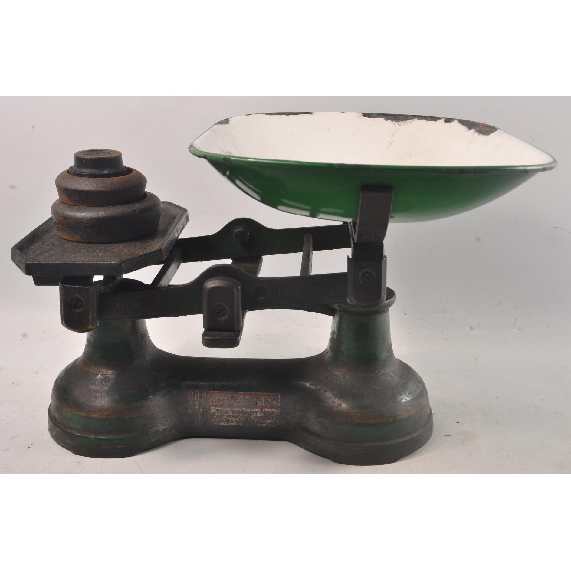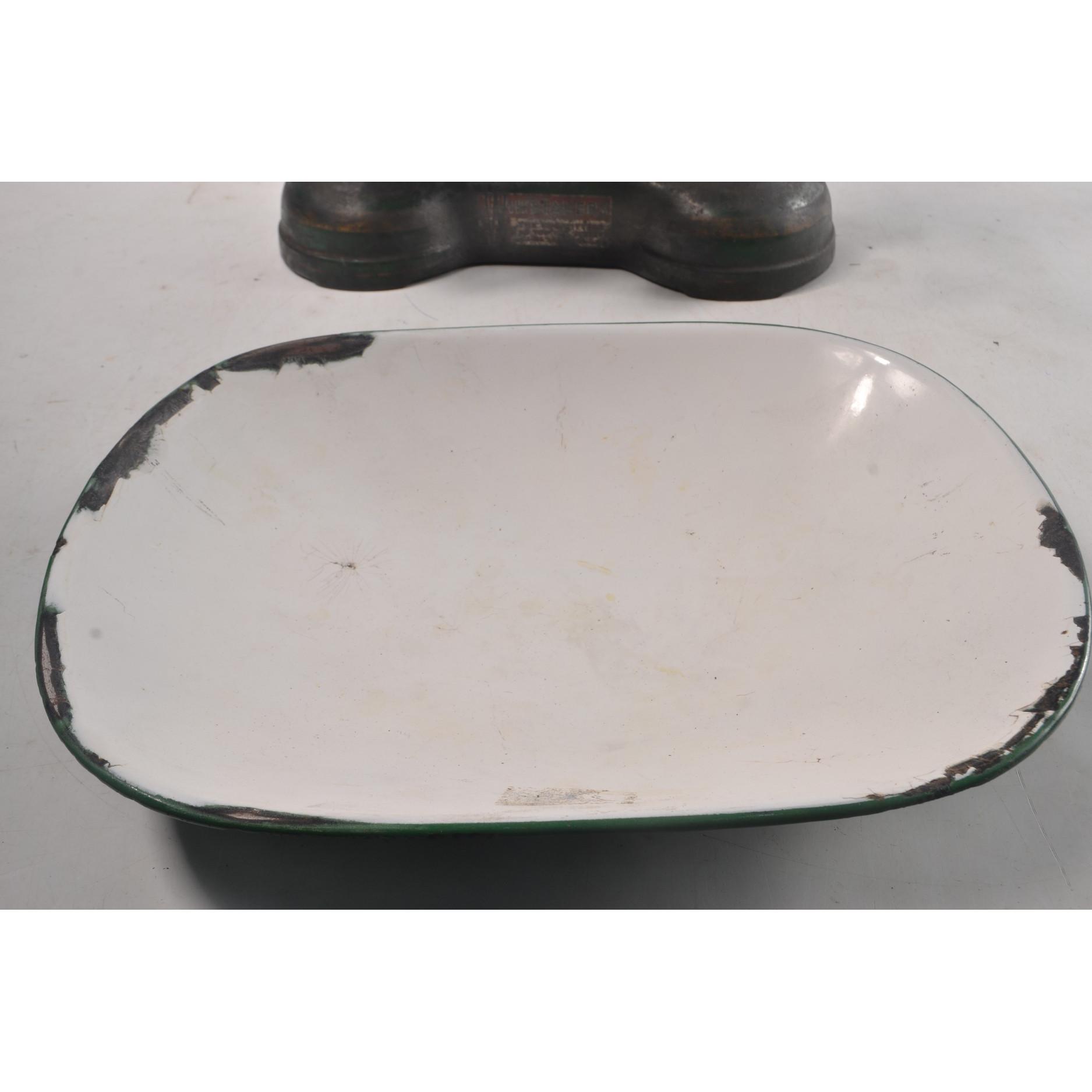 A set of large vintage scales with enamelled pan and 3 weights.
