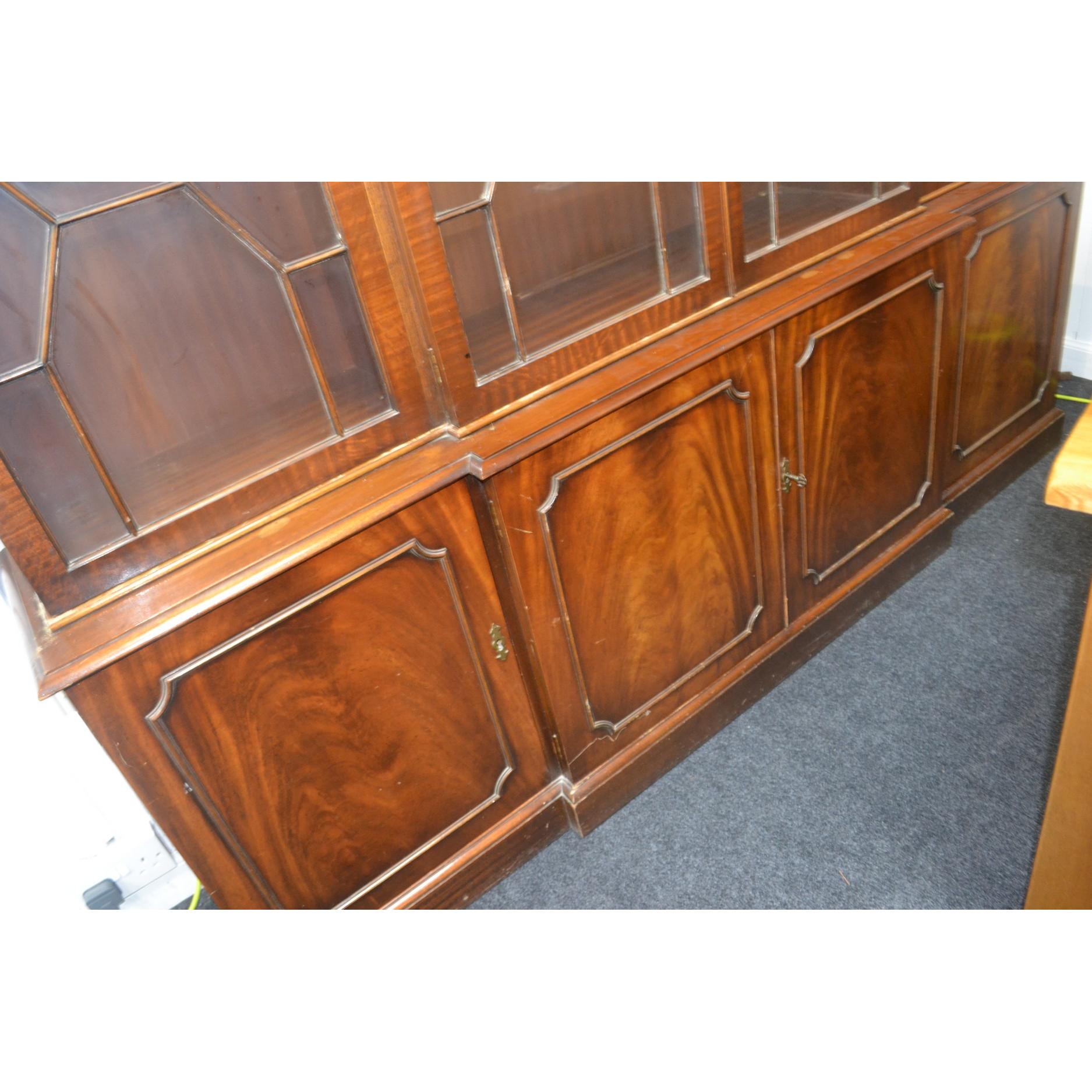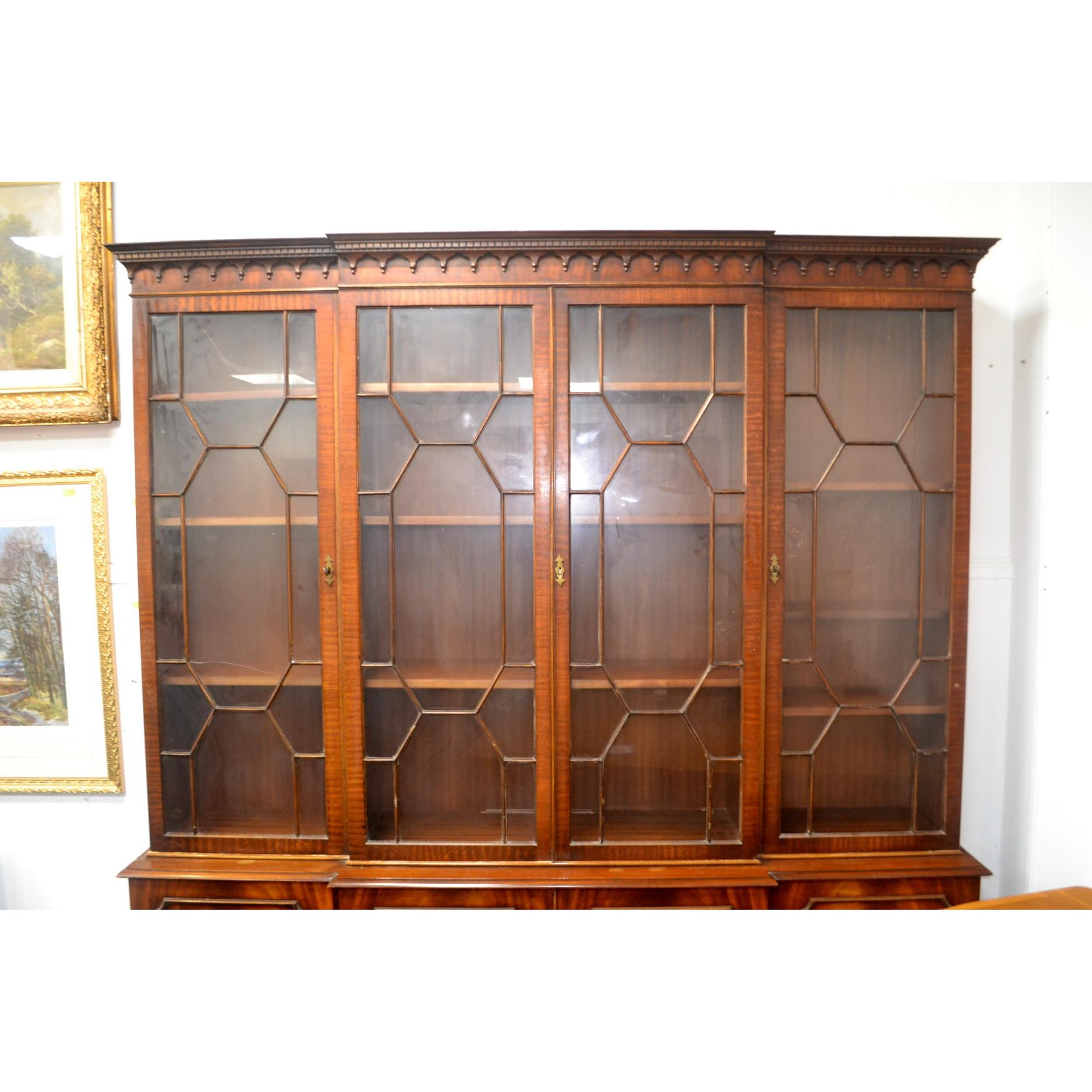 Large IMPRESSIVE Breakfront inspired bookcase ( comes in two pieces for moving etc) with four lockable glazed doors. One of the centre glass Panels has a crack, but still together, and not immediately noticeable. Cabinet has some wear and tear marks as you would expect