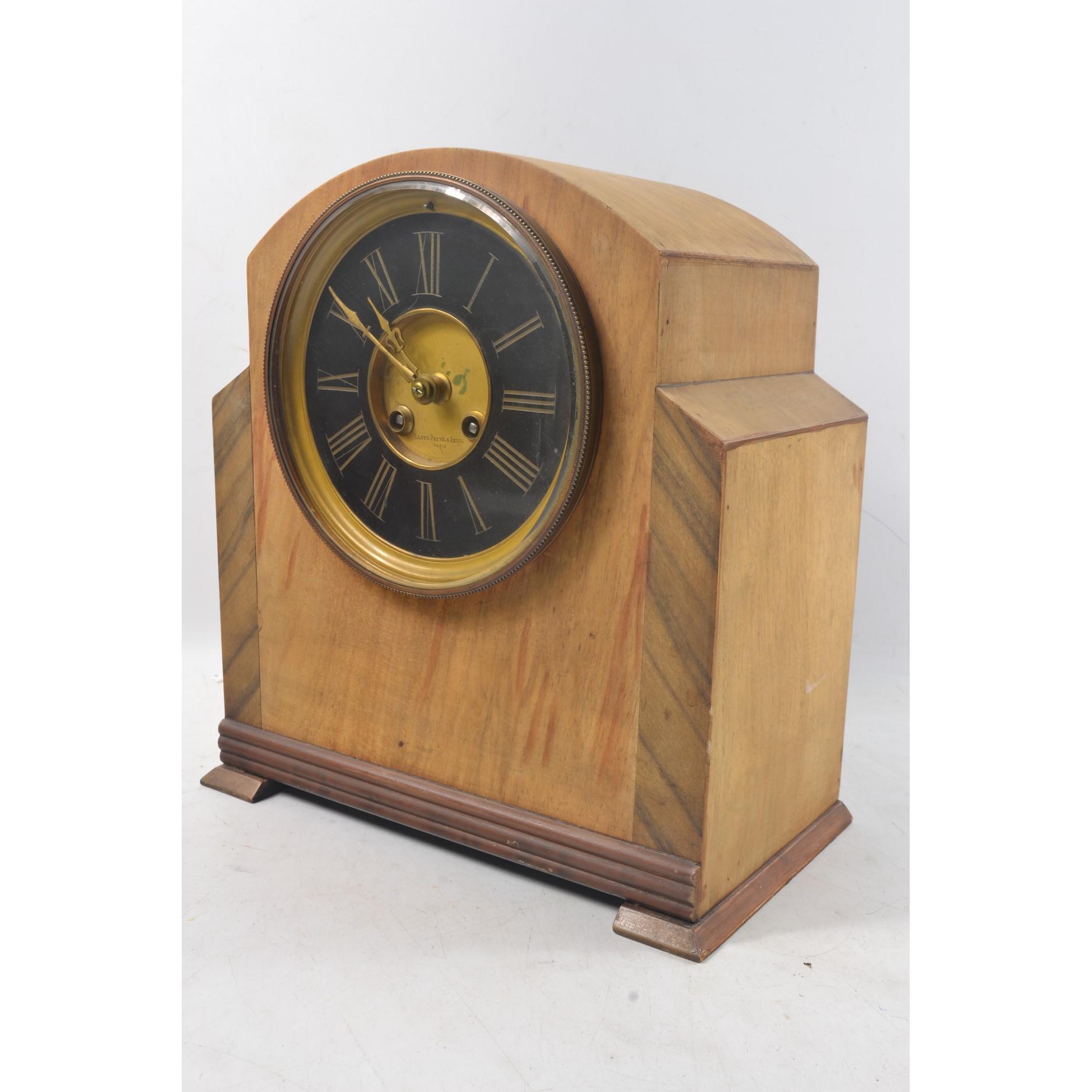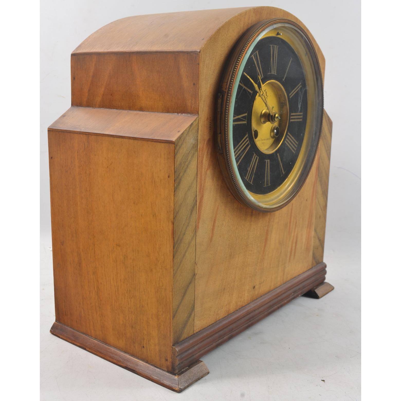 A nice ANTIQUE light wood cased LLOYD PAYNE & AMIEL PARIS chiming mantle clock With an unusual black clock face with Roman numerals, clock movement has a pendulum with ORIGINAL WINDING key.
