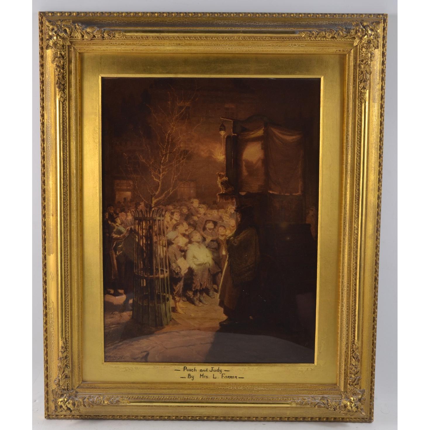 NICE QUALITY! A RALPH HEDLEY Vere eglommise glass inspired print of his famous painting ‘Punch and Judy’ within a period gilt frame 30cm long x 40cm highL: 30cm approx H: 40cm approx