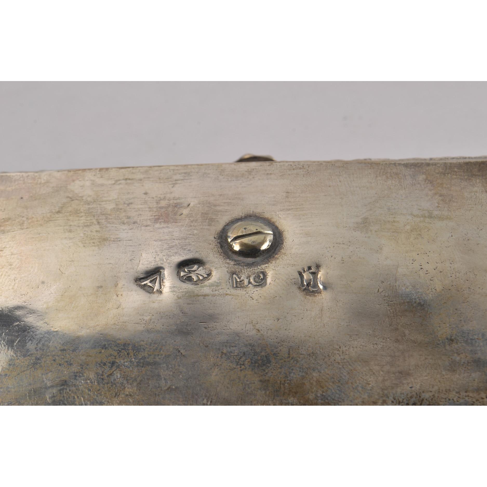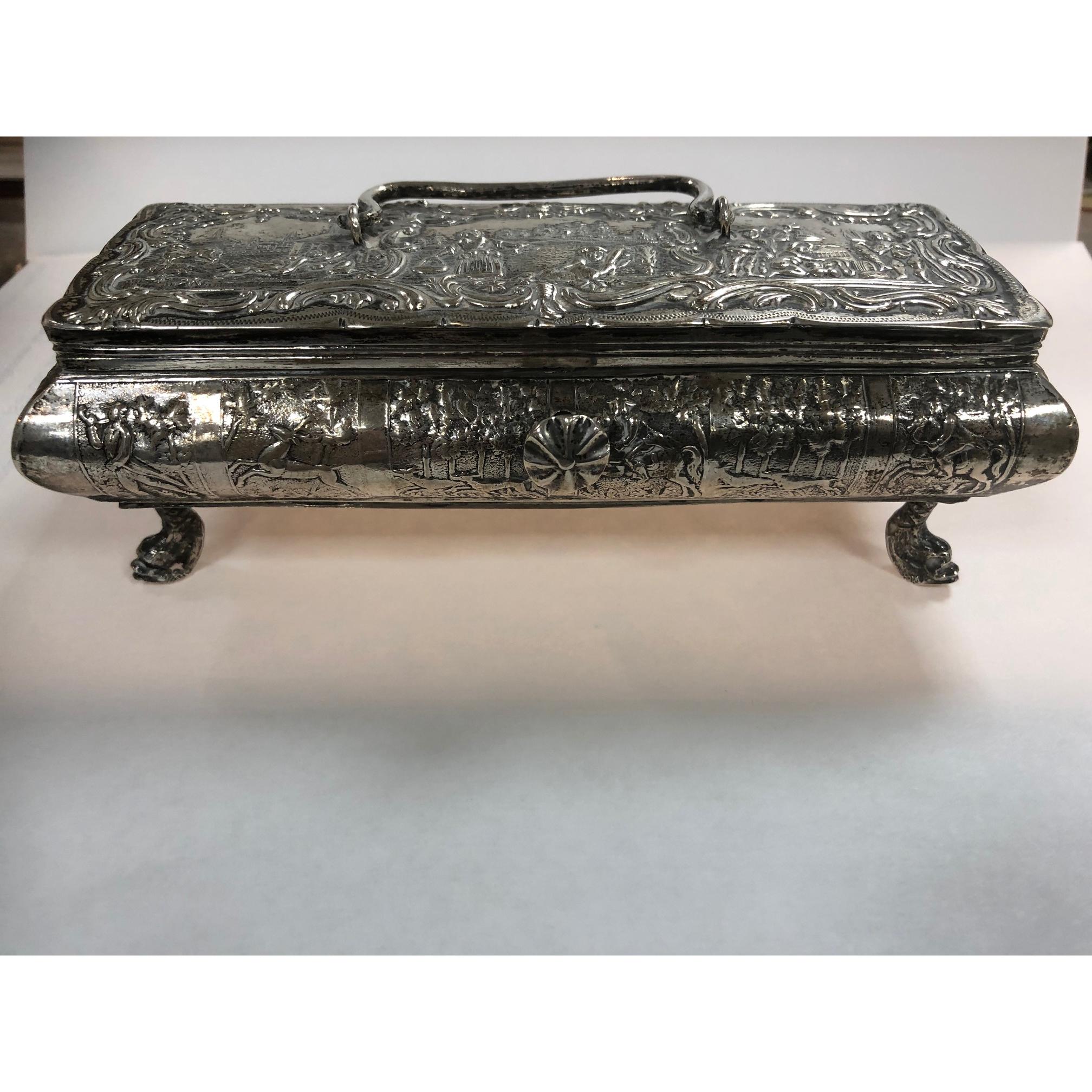 A BEAUTIFUL REPOUSSE crafted CONTINENTAL SILVER lidded and hinged push-button opening trinket/cigarette box with carry handle circa 1880's/1900's depicting a rural working scene with MC pseudo maker’s mark, a fern leave another pseudo maker’s mark and a running animal, in overall 'bomb' shape, height with handle in the raised position 7cm tall