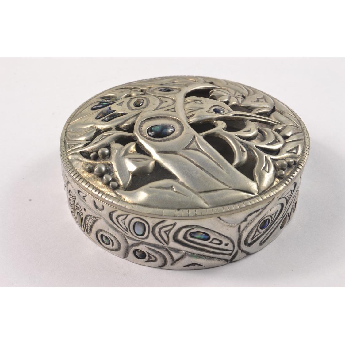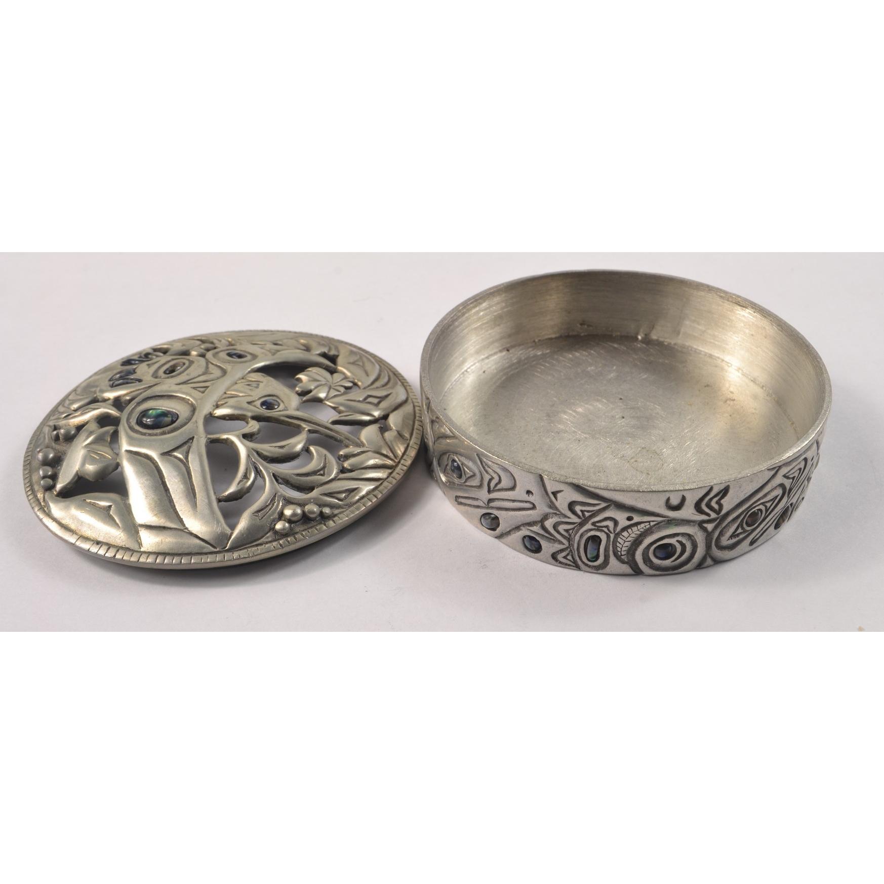 A QUALITY pewter style circular lidded trinket dish with pierced bird form design within lid, small pieces of 'abalone inspired' pieces within the overall design 7.5cm diameter x 2cm depth approx