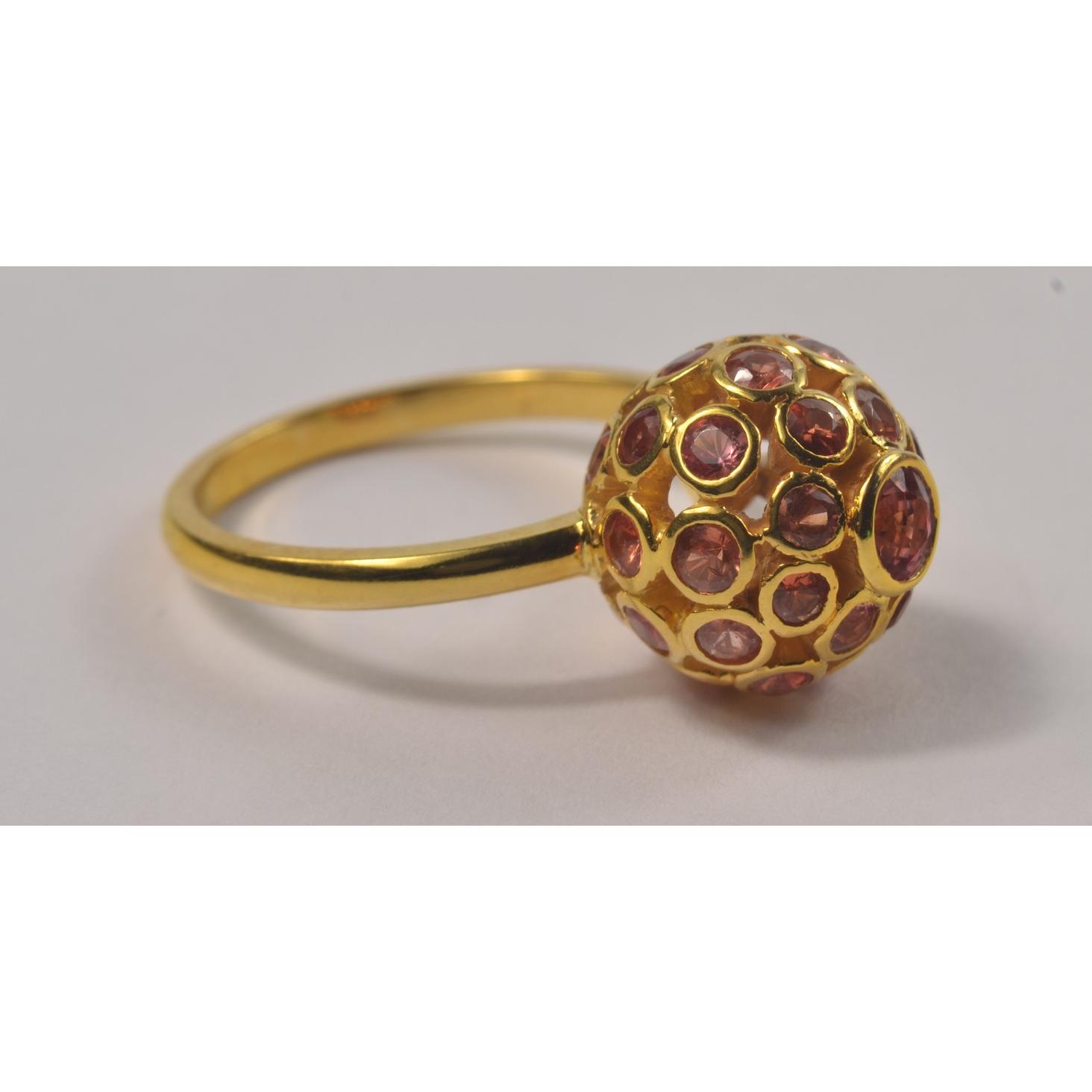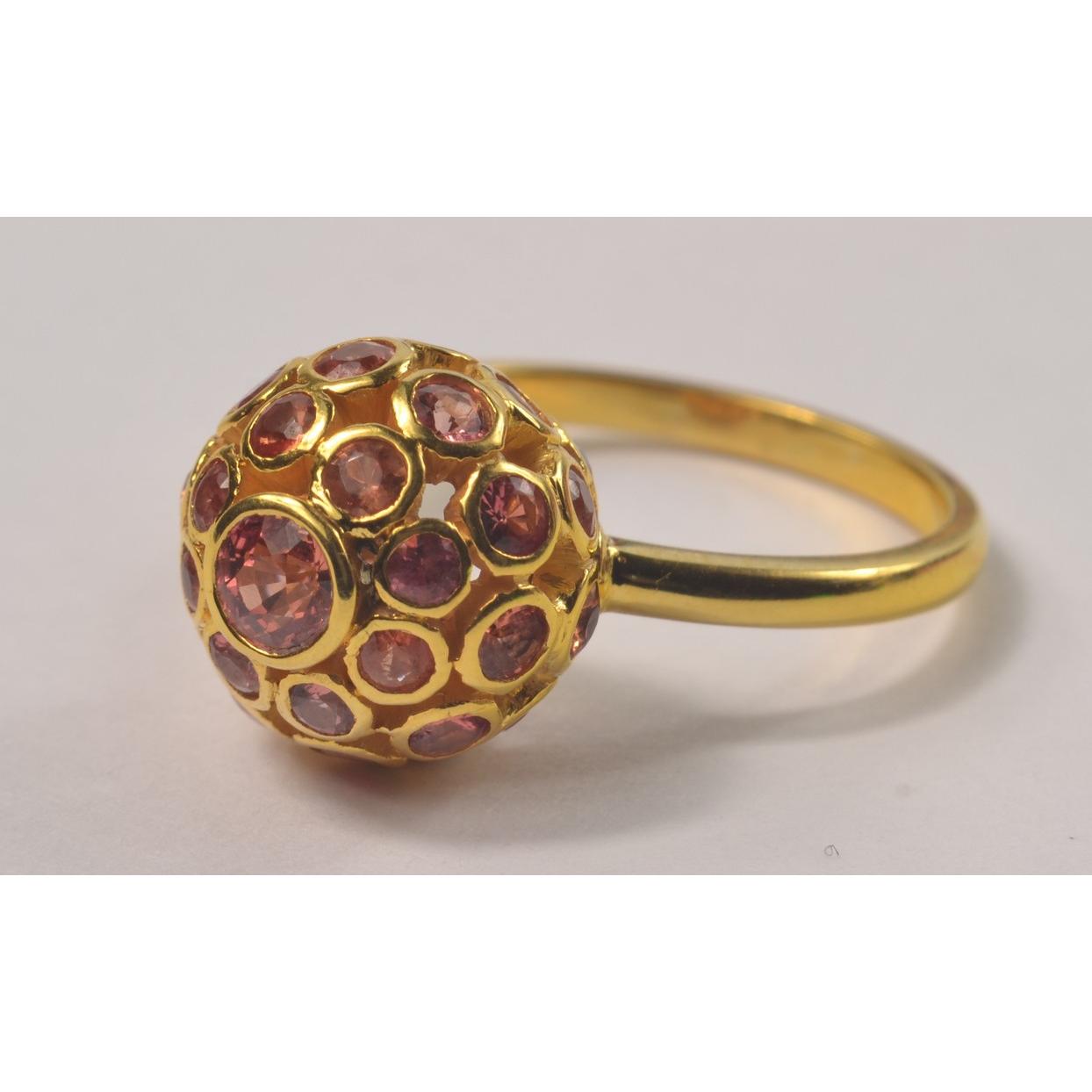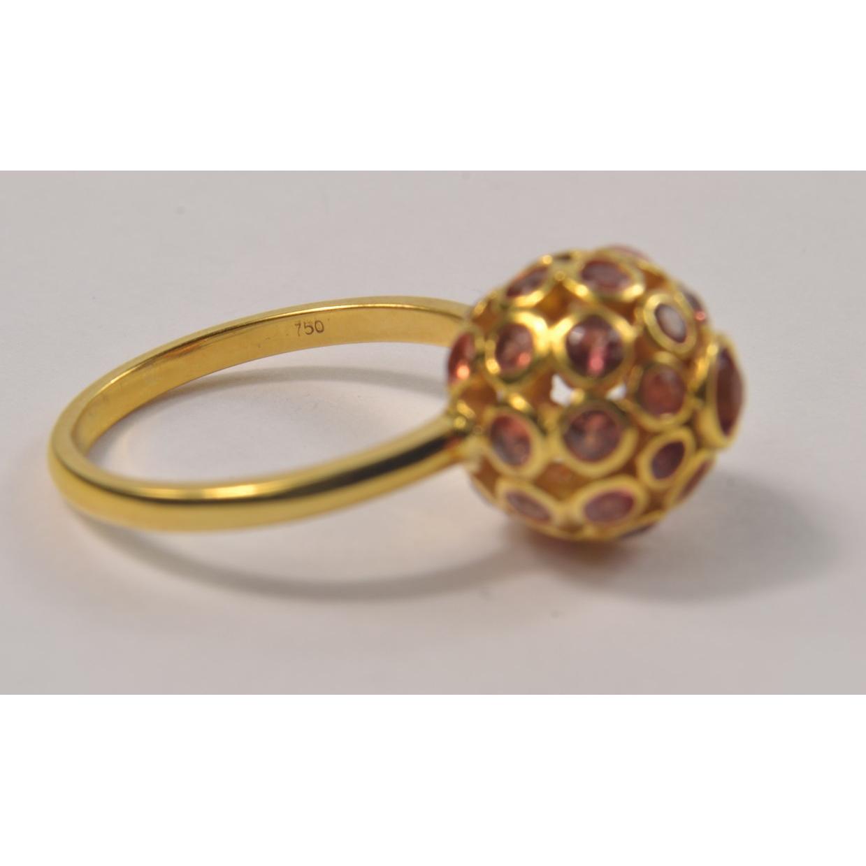 UNUSUAL! 750 stamped small pink sapphires encrusted and one larger centred sapphire inset within a spherical shape gross weight 6.40g approx ring size P as in new condition Gross weight approx 6.40g
