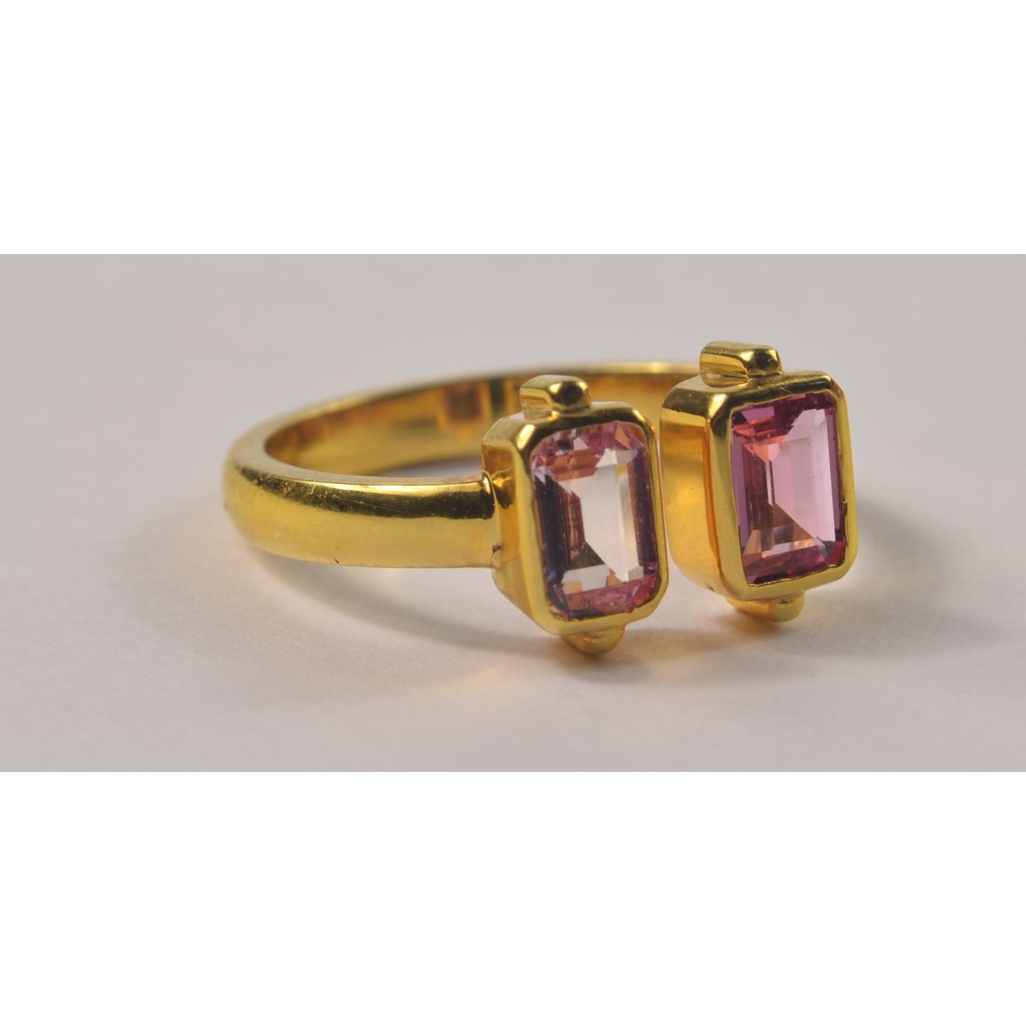 585 stamped yellow gold ring size M with a two Octagonal-cut CORUNDUM orangish/pinkish gem stones centred 3.58g gross weightGross weight approx 3.58g