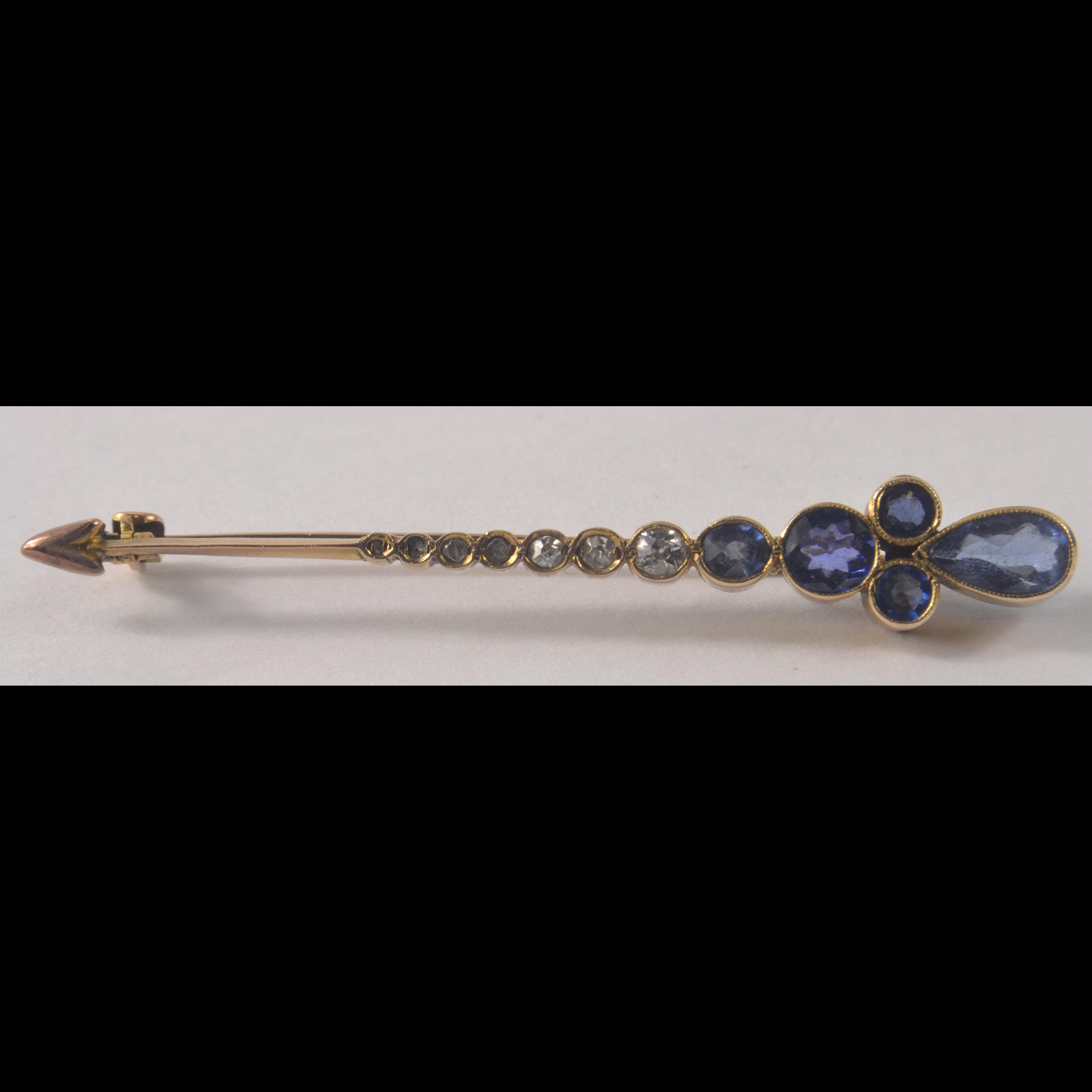 AN UNUSUAL! Beautifully crafted 9ct ( tested) Yellow Gold Arrow shaped bar brooch set with 5 Sri Lancan sapphires with a pinkish fluorescence and 7 graduated diamonds [ L 5.5 cm]