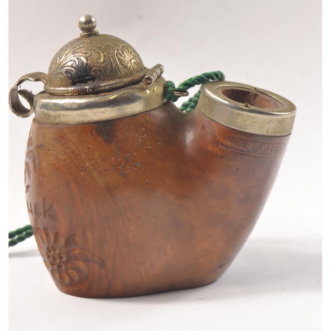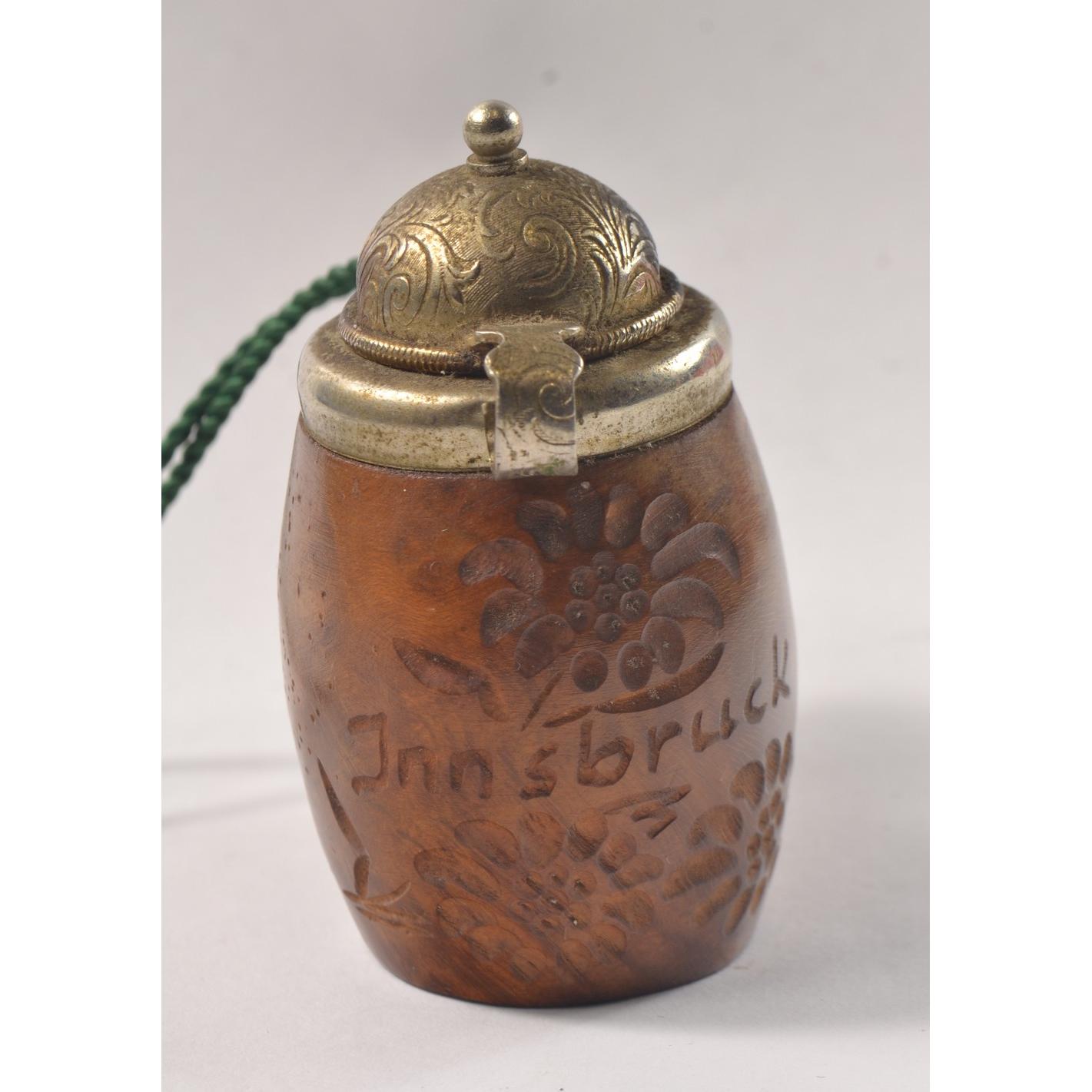 An INTERESTING ANTIQUE CURIO made in Innsbruk for holding tobacco? Wooden hand carved body with flowers and 'white metal fittings' with a 'flip-top' lid.L: 6cm approx H: 5cm approx Approx 1 pieces