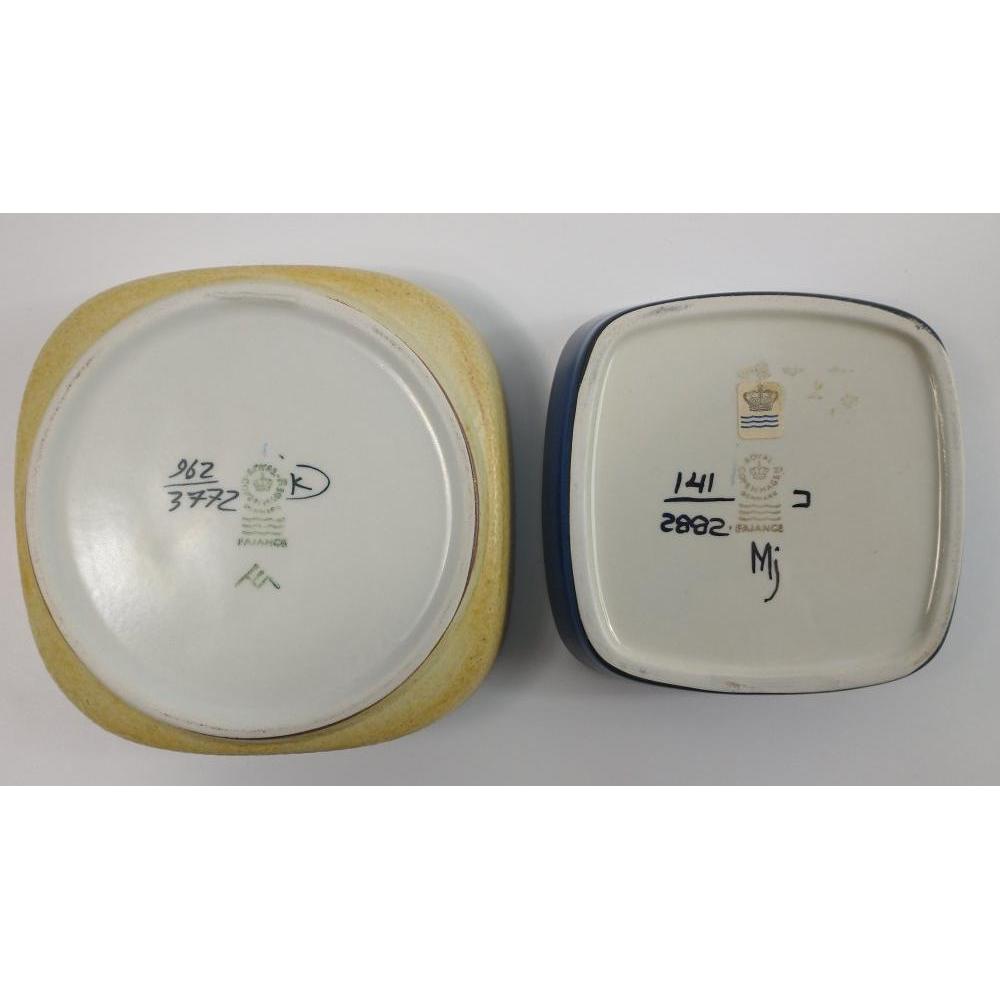 Two pin dishes stamped underside ROYAL COPENHAGEN Denmark Fajance, the larger one 962/3772 KD, autumnal leaf pattern 13cm square, and the smaller one retro floral style pattern marked to base 141/2882 MJ 10.5cm
