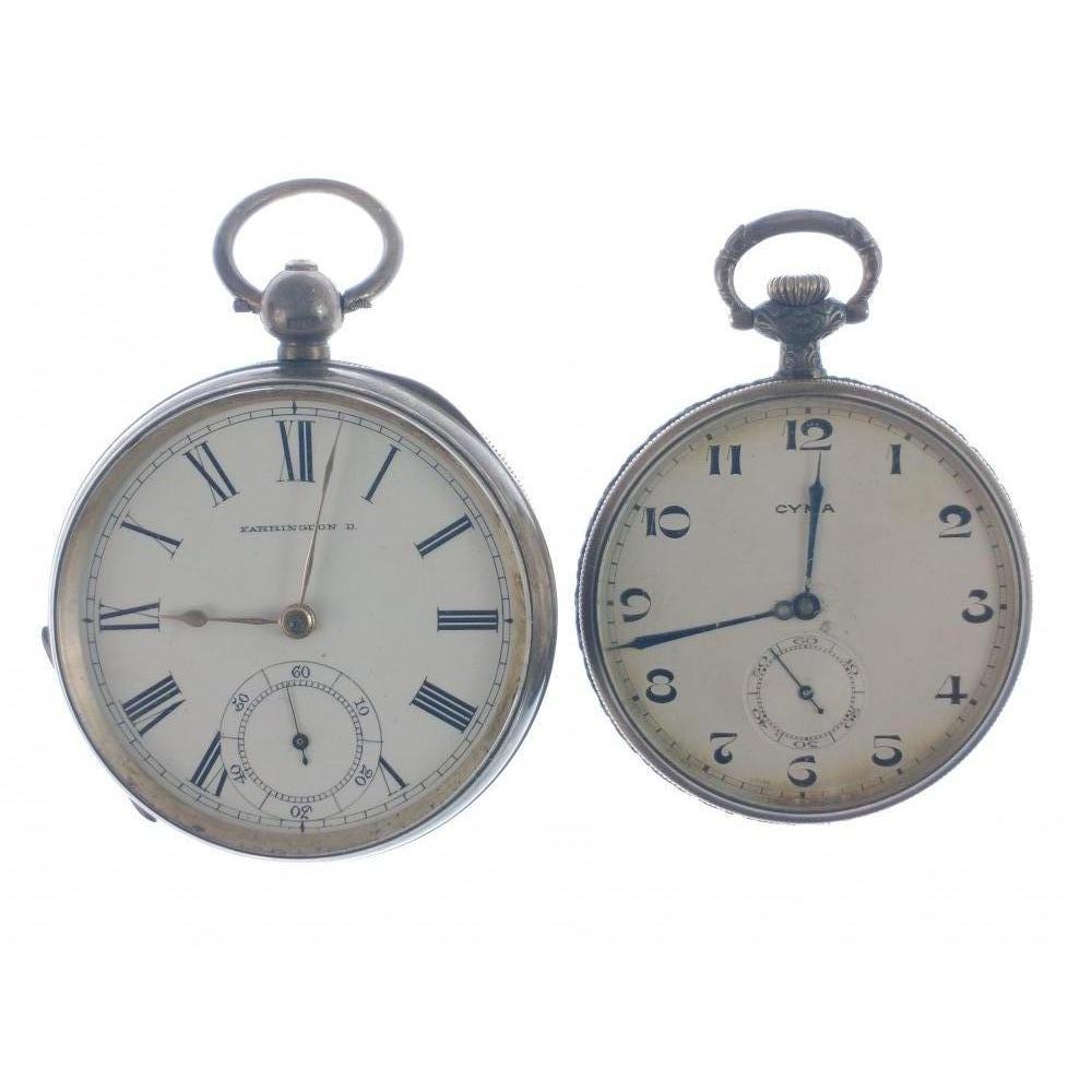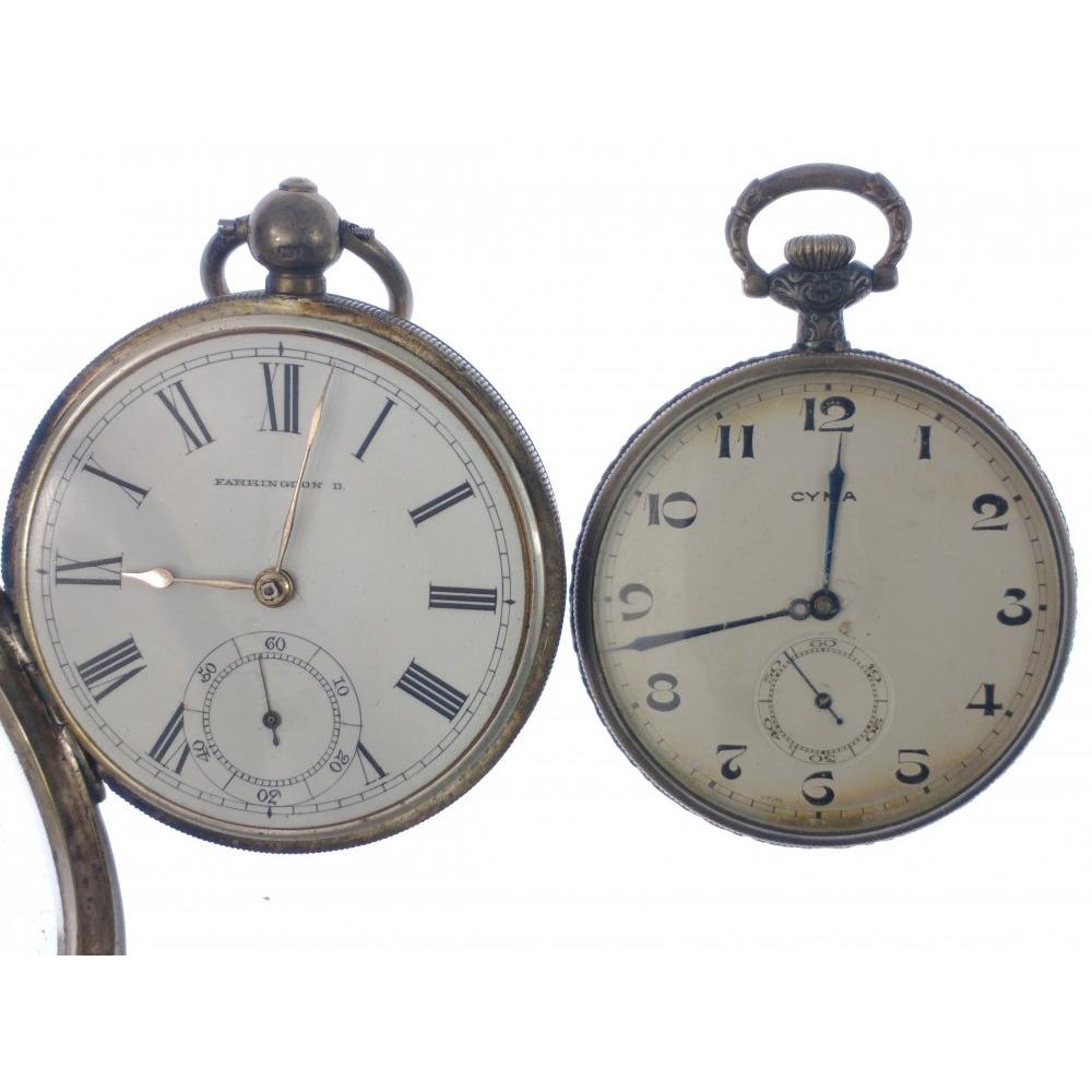 Two Silver hunter pocket watches, the larger vintage BIRMINGHAM Hallmarked by FARRINGDON, weight 108.3g gross, and still works when wound with key, (no key with watch) and the smaller vintage good quality Hunter watch by CYMA 925 case stamped weight 56.75g gross