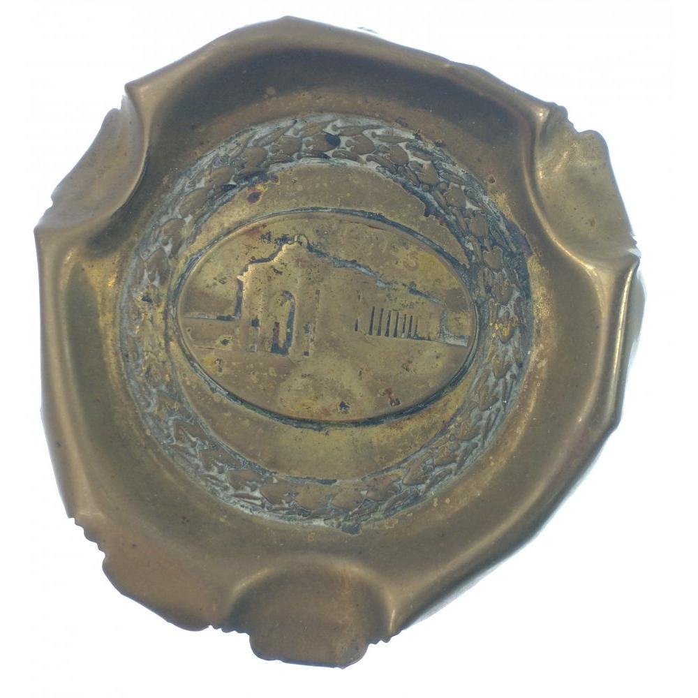 WW1 TRENCH ART three bullet casing small brass mounted ashtray with YPRES stamped on a raised badge within the centre of the ashtray, measuring 5.5cm height x 6.5cm diameter approx