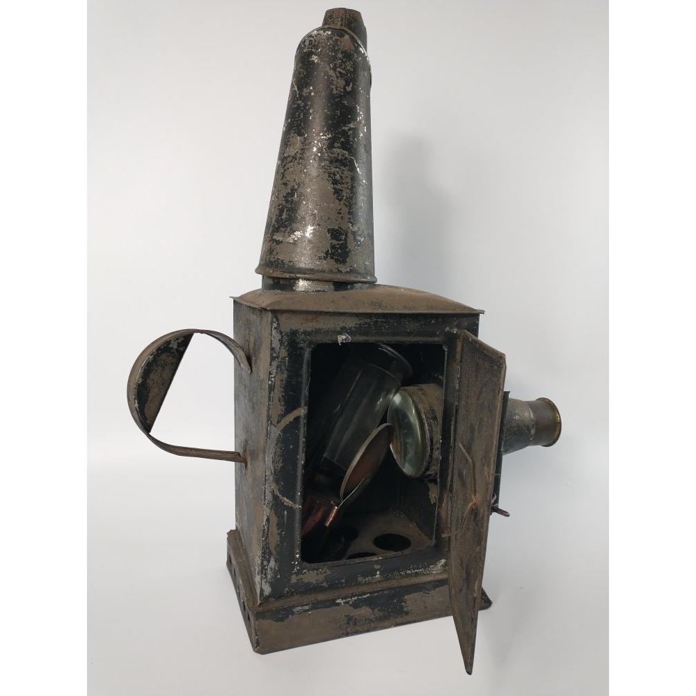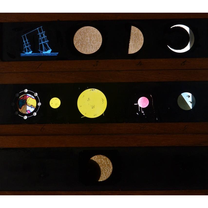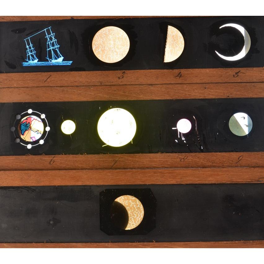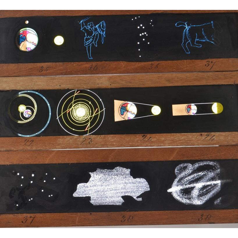 Victorian tin-plate Magic Lantern with glass chimney and burner intact(no manufacture name) Coloured Glass mahogany framed Magic Lantern slides within sliding top wooden storage boxes, 3 boxes to include , box 1 slides x 12 of the constellation on the celestial sphere showing groups of stars forming perceived outlines and patterns, planets and stars, thoroughly interesting,