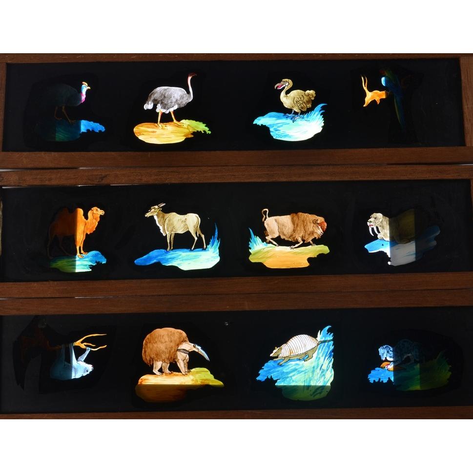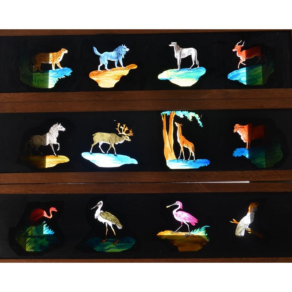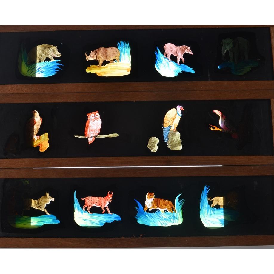 Box 2 to include x12 Natural History Slides lions, Eagle, Puma, Lion, Elephant, Armadillo, Sloth, Tiger, Wolf, Flamingo, Vulture etc etc etc x 4 hand painted pictures per slide,