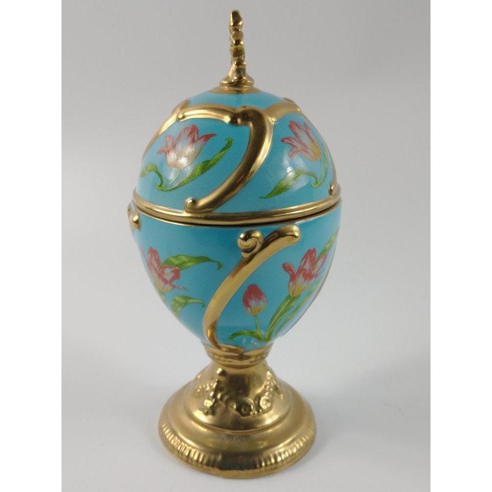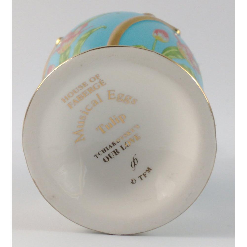 BEAUTIFUL! HOUSE OF FABERGE musical egg 'TULIP' playing TCHAIKOVSKY'S 'OUR LOVE' 13cm tall, diameter 6cm approx with certificate of authenticity.H: 13cm approx D: 6cm approx Approx 2 pieces