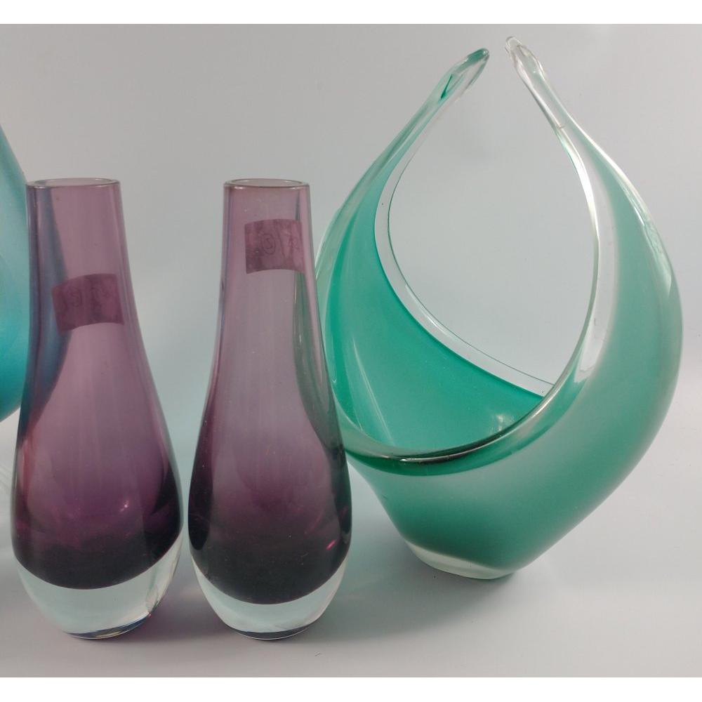 A large blue/greenish glass brandy bowl 23cm tall approx, a pair of CAITHNESS style purple glass heavy bottomed bud vases each 18cm tall and lastly two unusual shaped MDINA STYLED glass three and two pronged bowls15cm tall approx