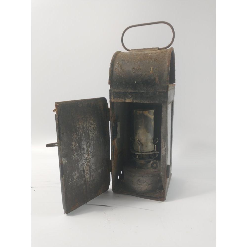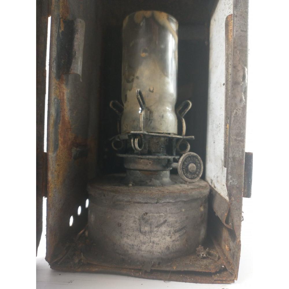 A VINTAGE tin plate miners lamp including still its glass chimney and burner 20cm height