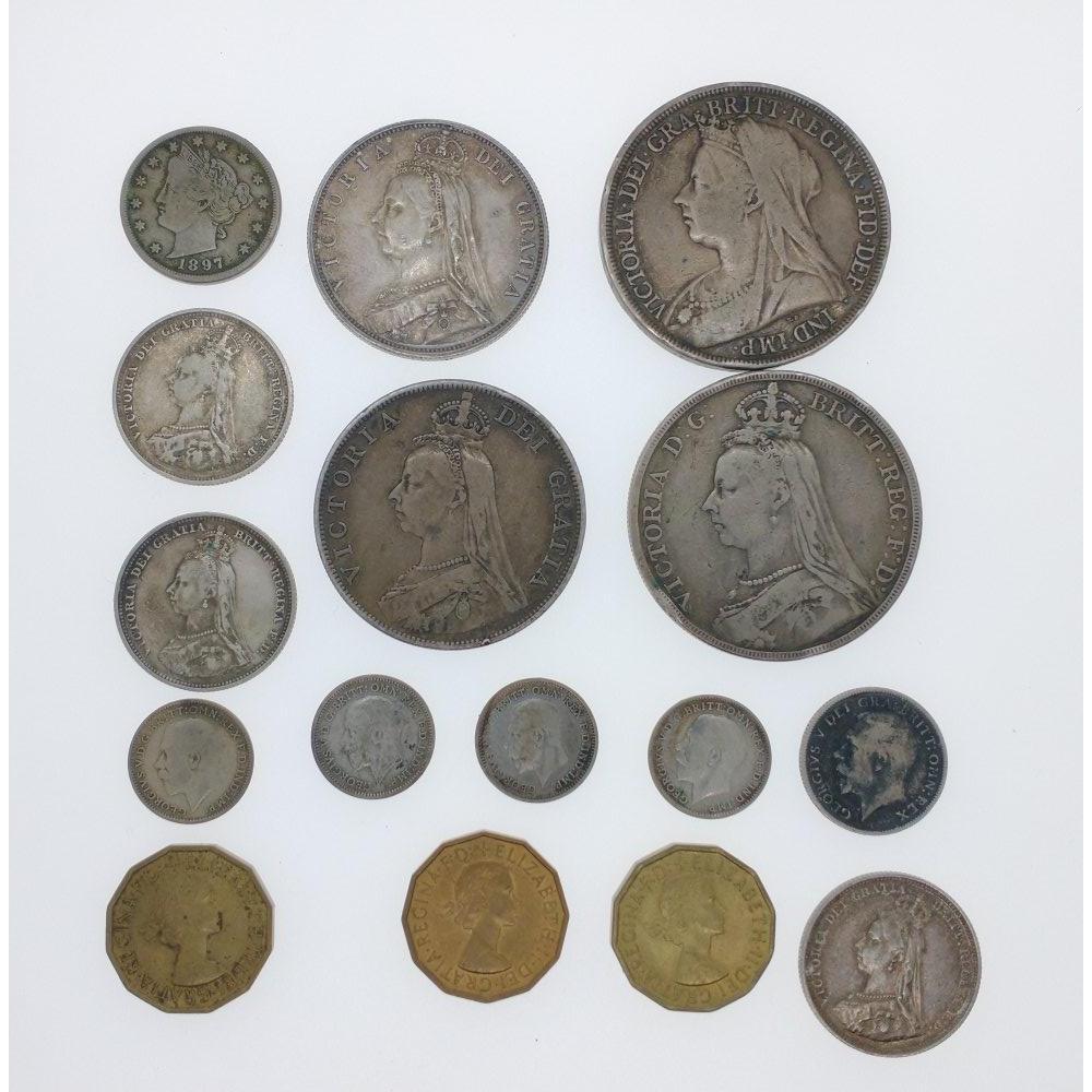 A small collection of Silver Victoria Crowns 1889,1896, Half Crown 1890, an 1887 Victoria coin, a 1919 George V coin, a silver 1897 V Cents coin, 3 further silver Victorian coins 1888,1887 and 1887 , also 4 silver three pence, and 3 brass three pense and a tiny vintage black leather purse