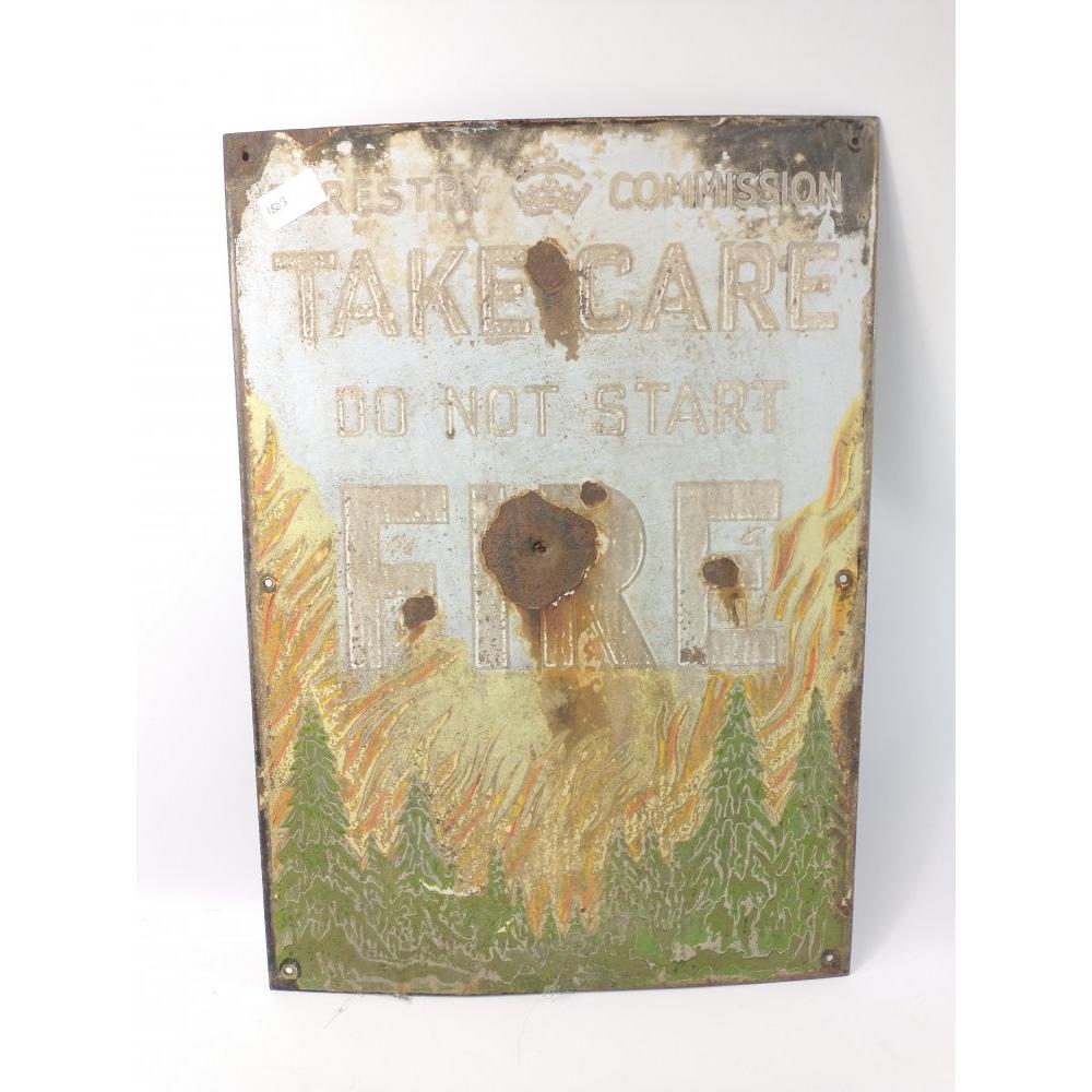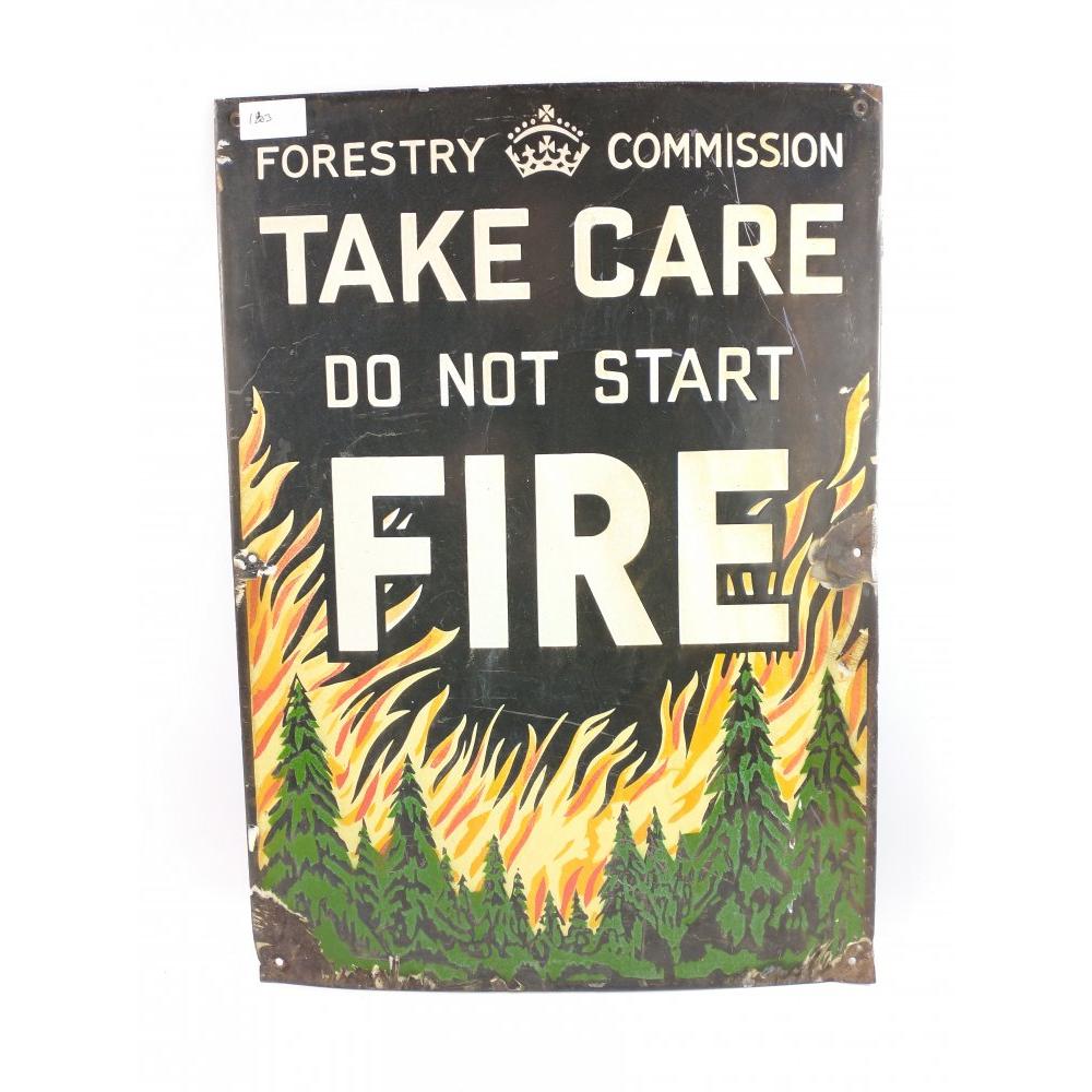 A pair of vintage FORESTRY COMMISSION c1940's 'Take care Do Not Start FIRE ' galvanised enamelled metal signs, one in good condition, the other very faded condition and possibly had a few rifle shots at it! but full of charm both 53cm High x 38cm long
