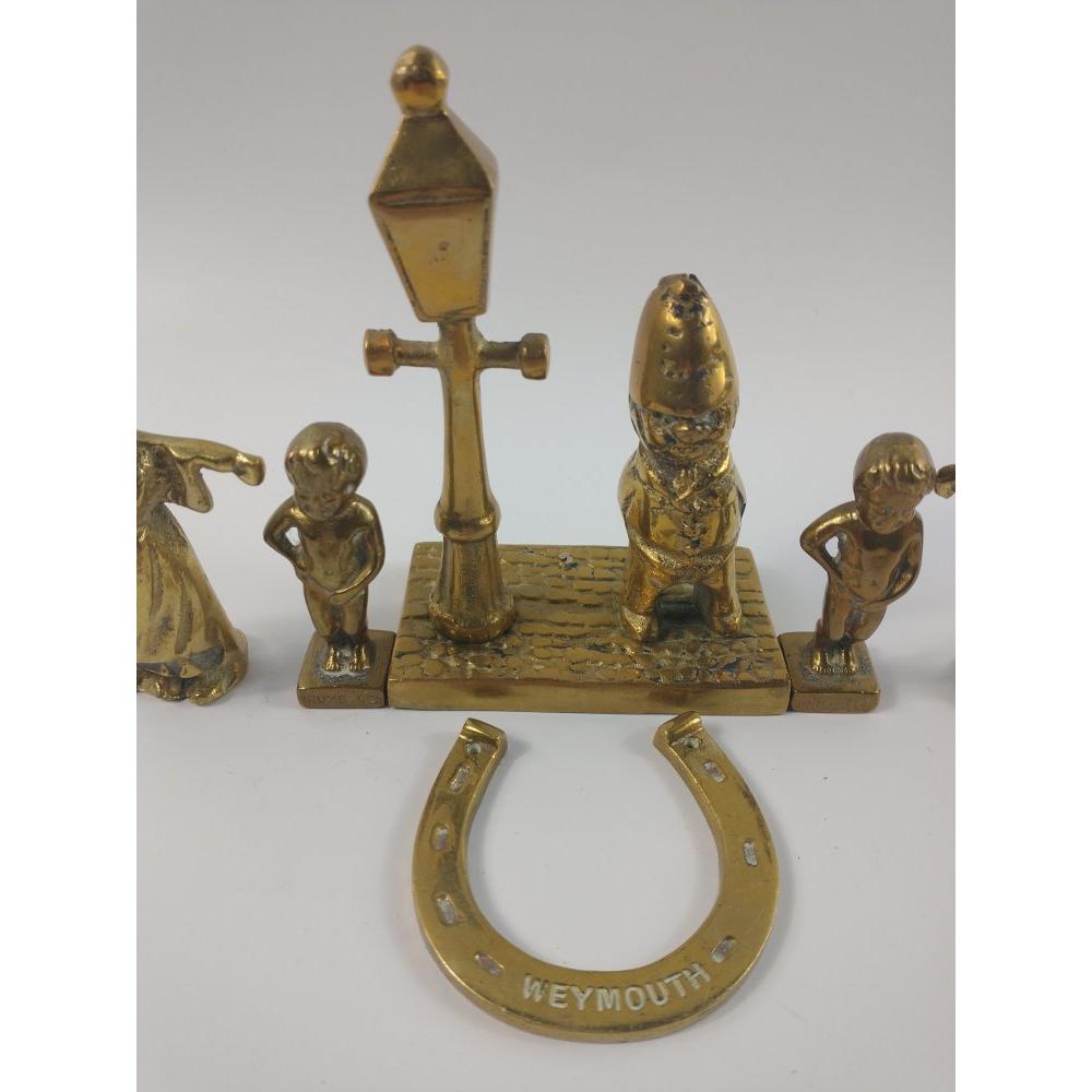 Collection of brass ware to include policeman next to Victorian style lamp post (W:8.5cm H: 12cm approx), horseshoe stamped WEYMOUTH , pair of young boy figures marked BRUXELLES, milk maid and milk man Approx 6 pieces