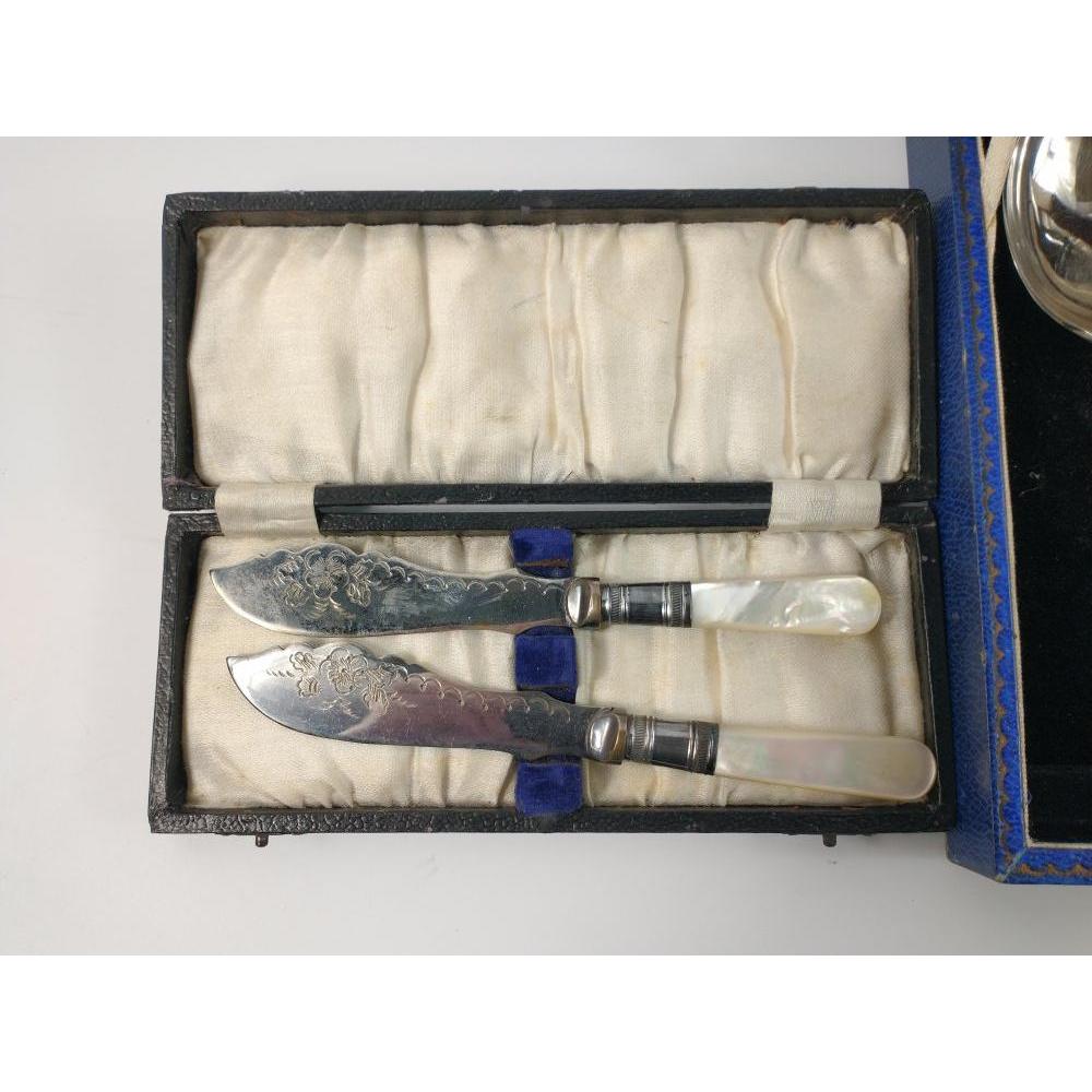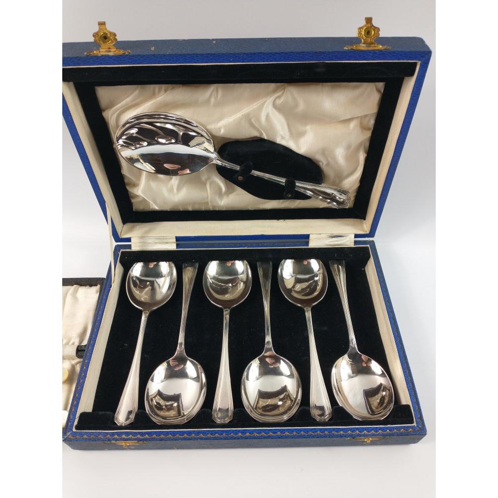 A canteen of six EPNS dessert spoons with large desert spoon in good condition, with also a small cased twin set of butter knives with mother of pearl handles Approx 2 pieces