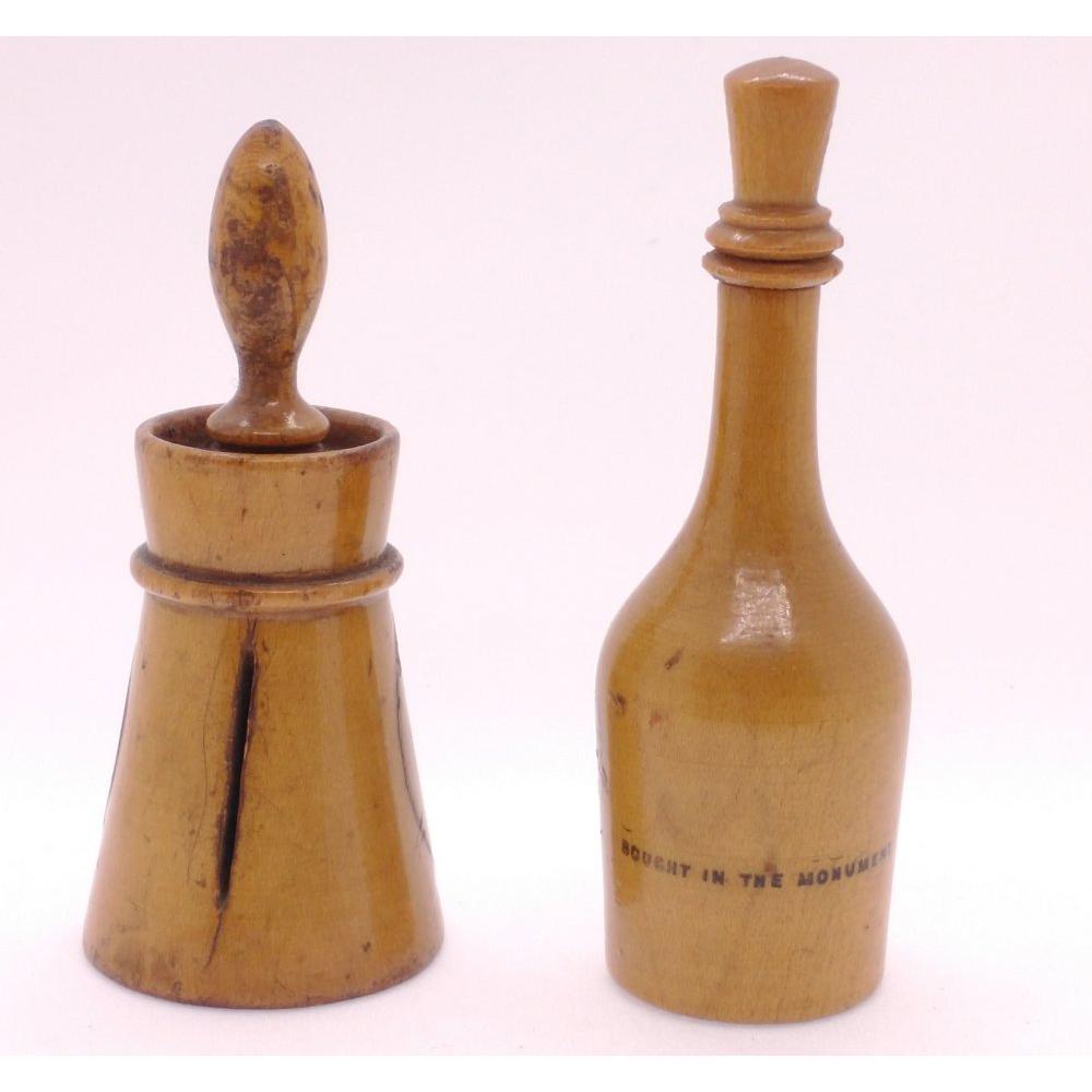 Two small pieces of Vintage MAUCHLINEWARE depicting BURN'S MONUMENT in the shape of a bottle 7cm tall and a Galashiels scene 6.5cm tallH: 7cm approx Approx 2 pieces