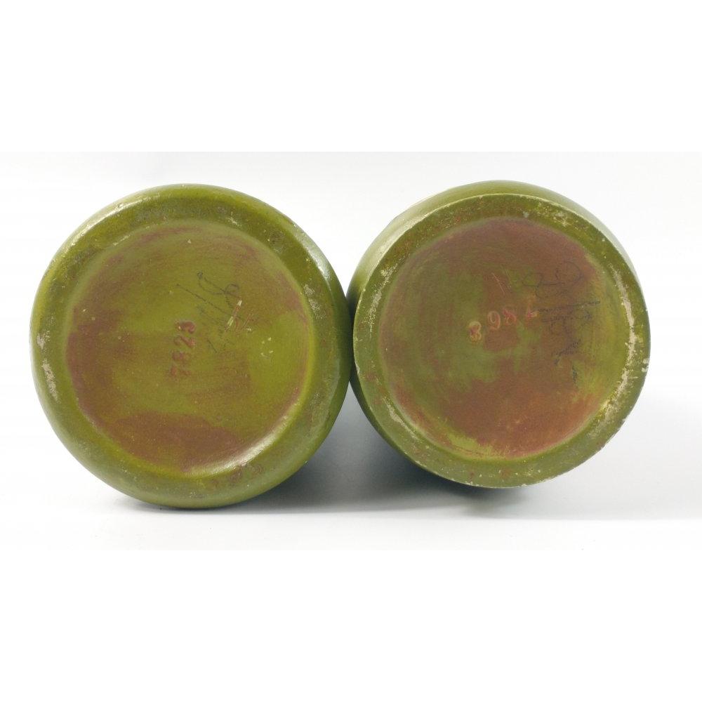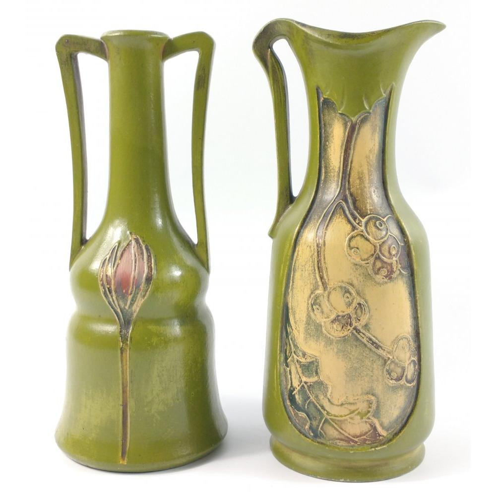 A vintage twin handled MOORCROFT pottery inspired vase with floral design on both sides on a green paintedbackground with 7828 numbered on the base, the other same styled vase with a single handle with 7868 numbered on the base - nice quality!