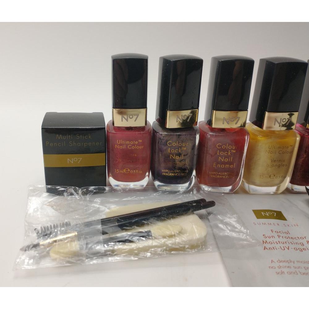 A selection of No 7 nail varnishes multi colours etc with some foundation samples and an eye pencil sharpener etcApprox 8 pieces