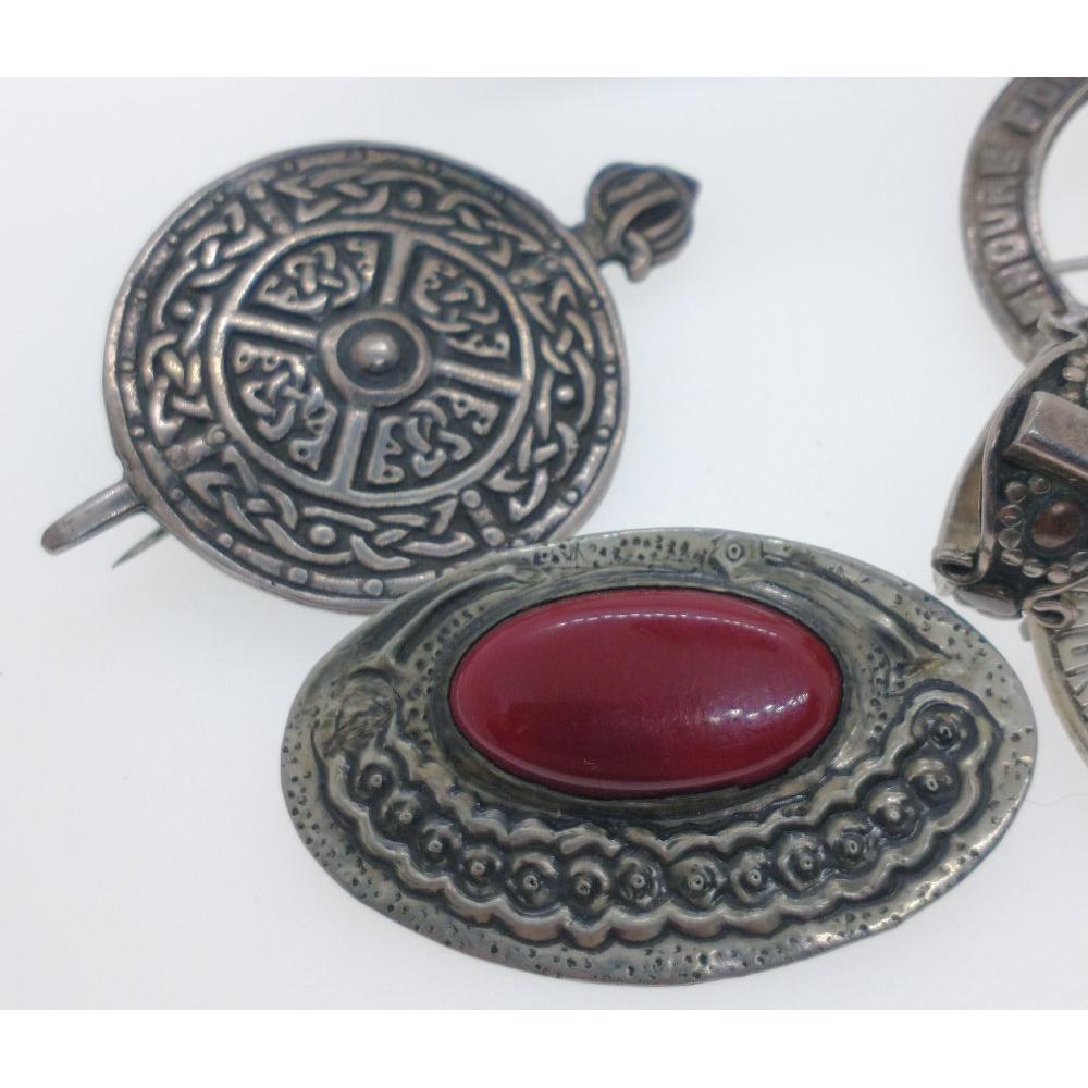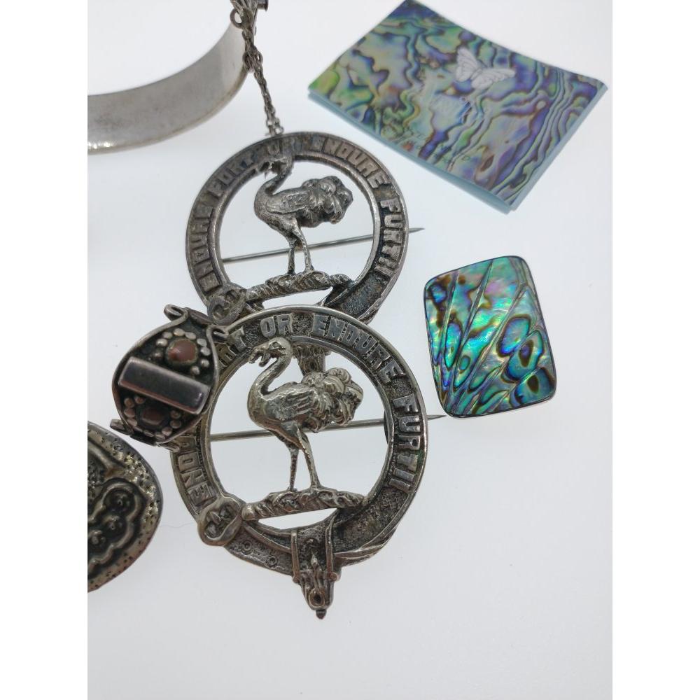 TOPAZIO stamped white metal (Portugese Silver?) decorated bracelet weight 21.4g, two pieces of CELTIC jewellery brooches, one stamped Sterling in the form of a sword and shield 4.5cm, the second piece(white metal) with an oval red stone and two Lindsay Clan Motto pin badges in white metal 4cm diameter and a stamped white metal brooch with ARIKA PAUA SHELL 2.5cm length 4.3g weight gross and a white metal mCeltic inspired ring size N