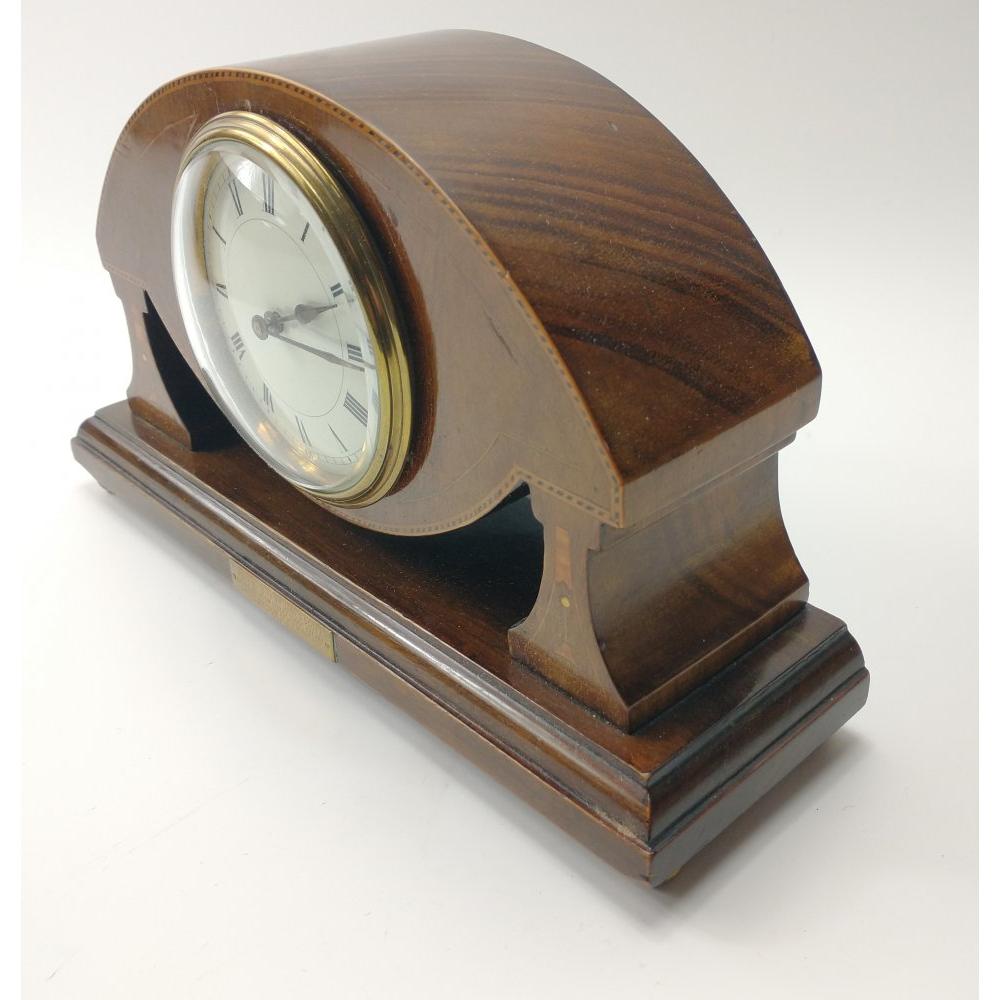 ANTIQUE high quality timepiece with string inlay edging and in an UNUSUAL design, an oval clock body on decorated pillars, engraved as a marriage gift in April 1921, with a French movement and comes with original key. This clock is in FULL WORKING ORDER!