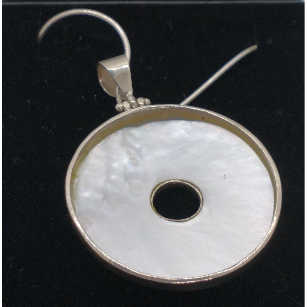 Unusual mother of pearl circular pendant with star motif in 925 stamped surround on 925 stamped chain in presentation boxL: Chain: 40cm approx Gross weight approx 12g