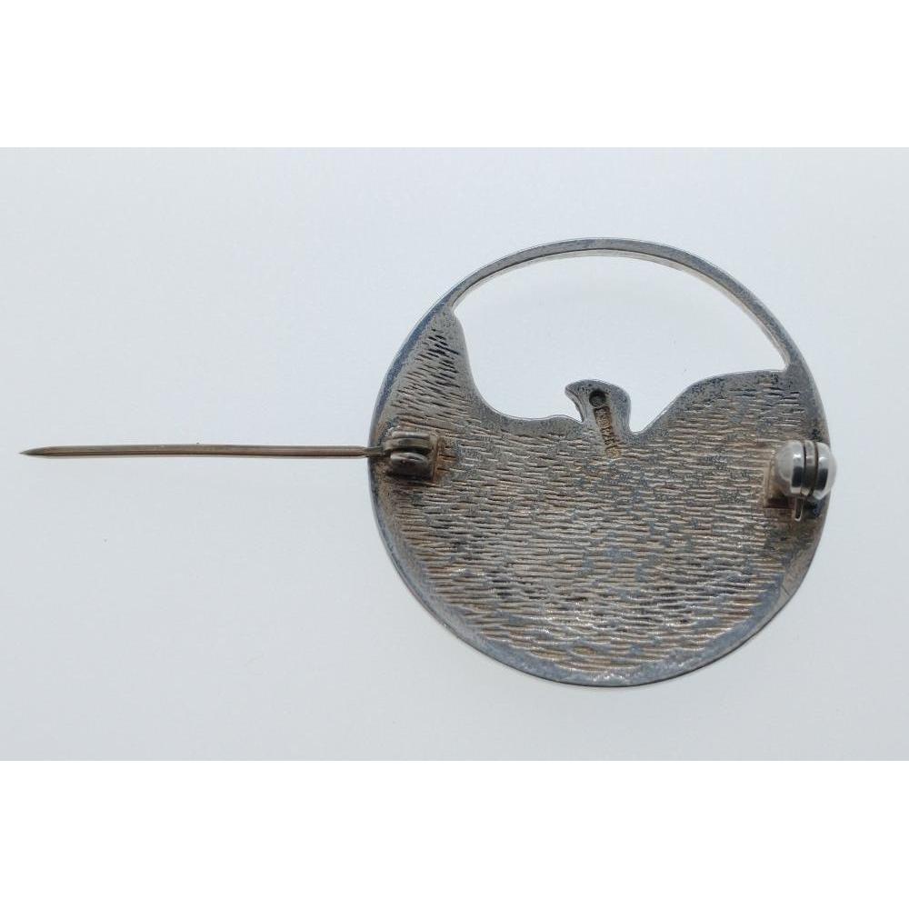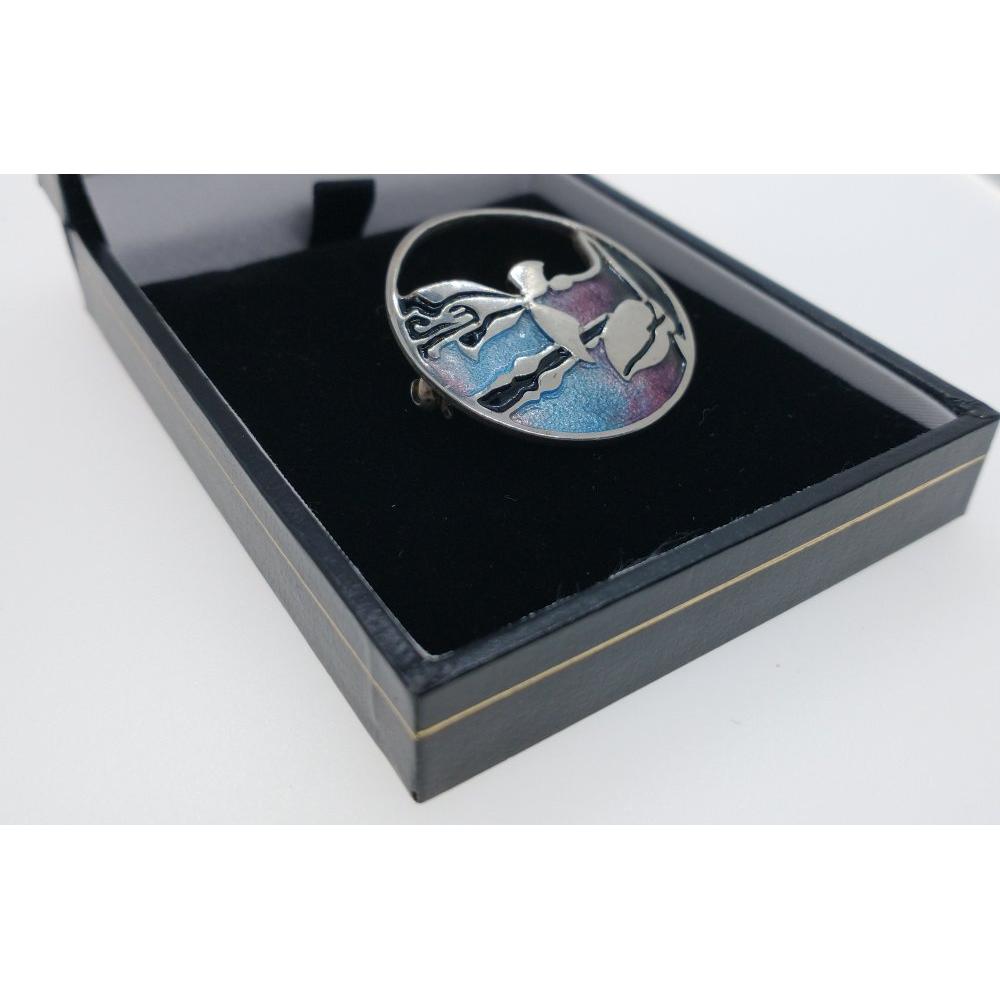 925 stamped silver circular brooch with blue and purple graduated background and flower head and leaf design. Possibly ORTAK (stamped MG in circle) in presentation boxW: 3.5cm approx Gross weight approx 8g