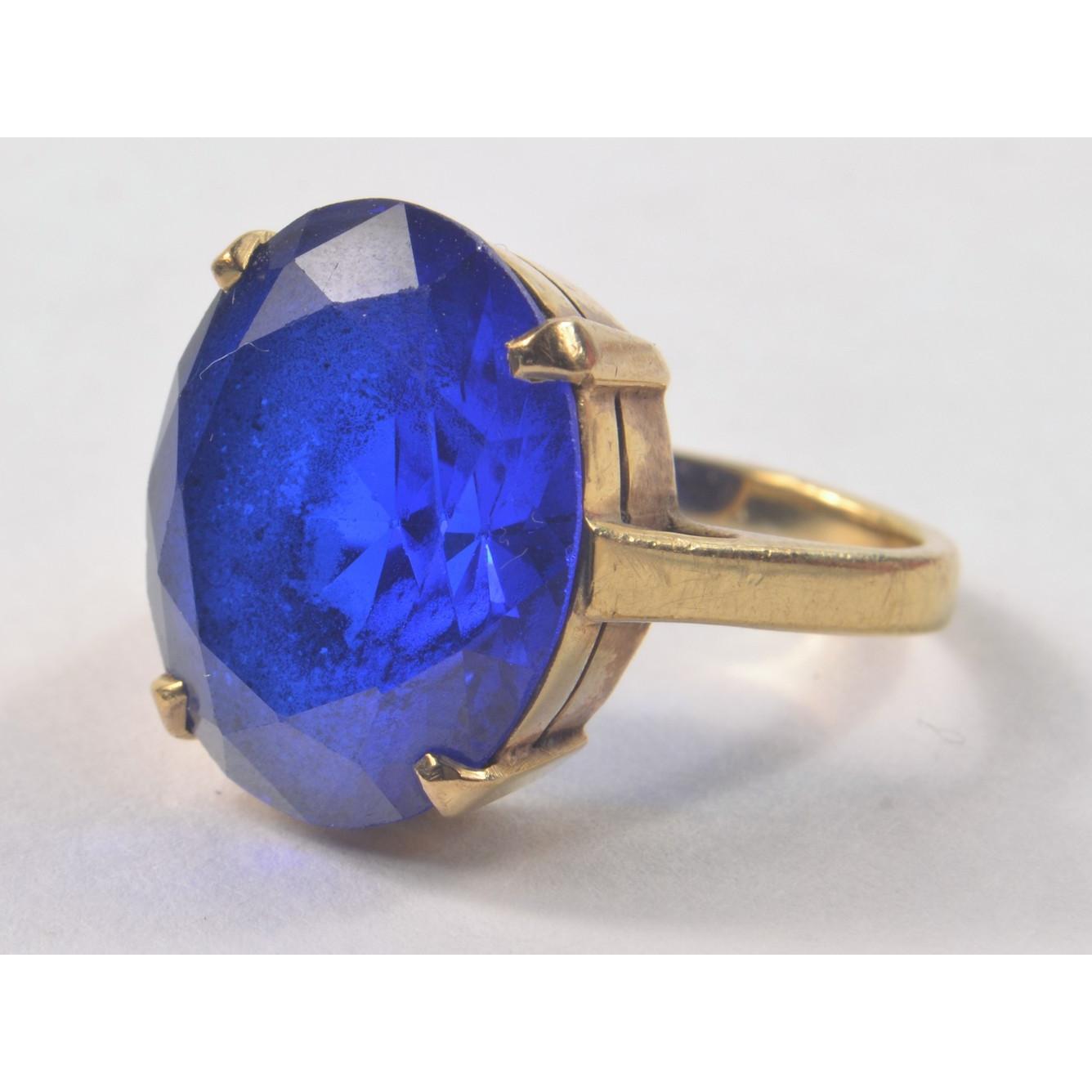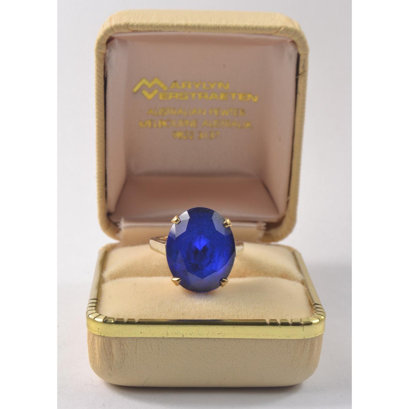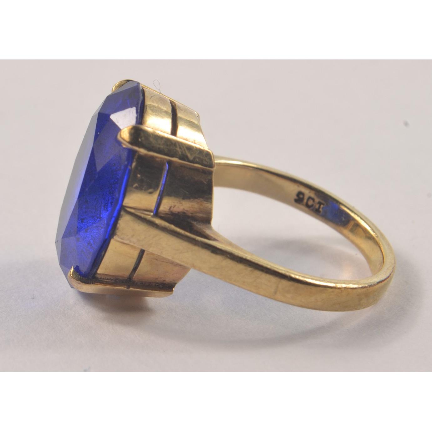 9ct Stamped Yellow Gold Ring set with large blue oval cut stone. [ ? Tanzanite ] stone is 1.5cm x 1.2cm approx [ size M ]