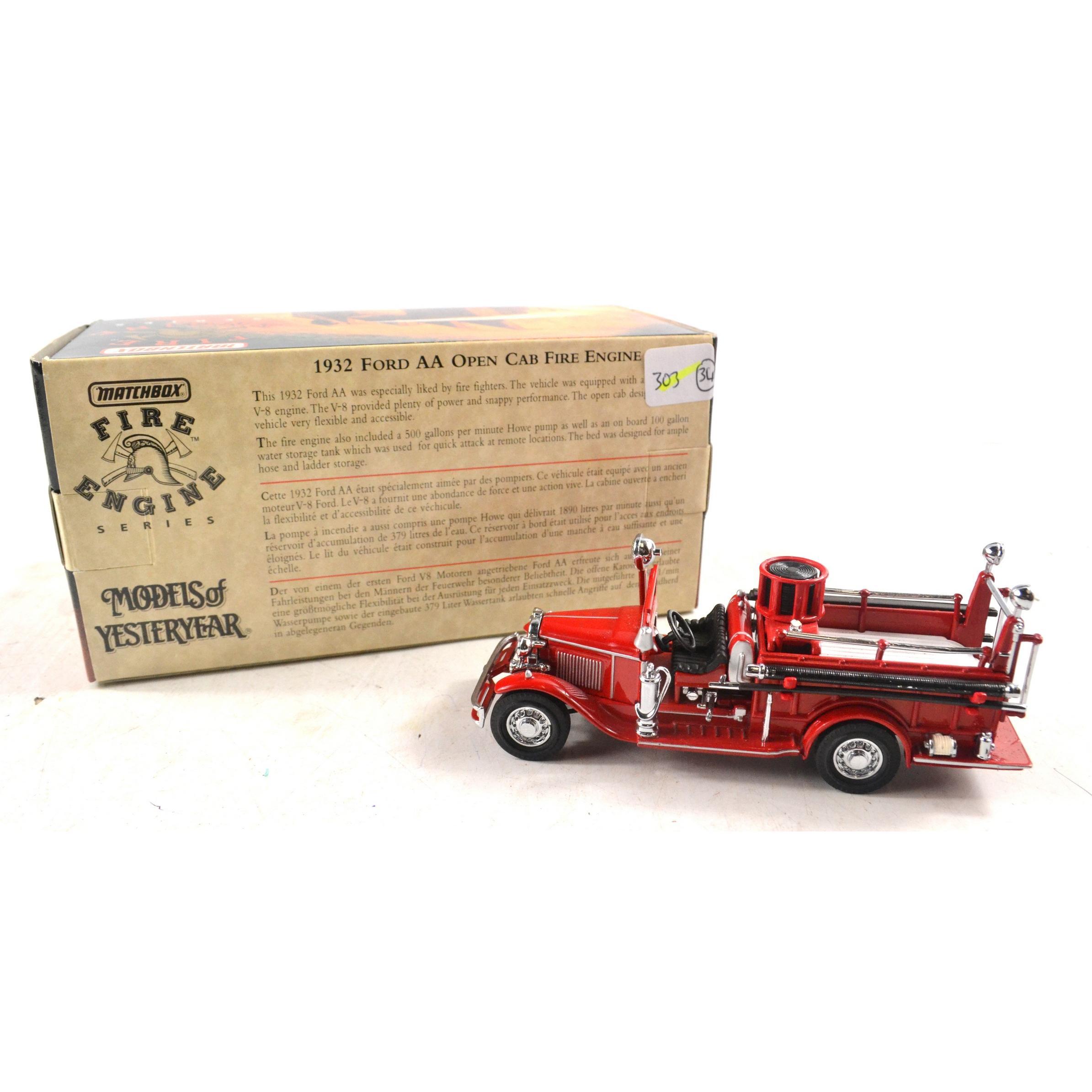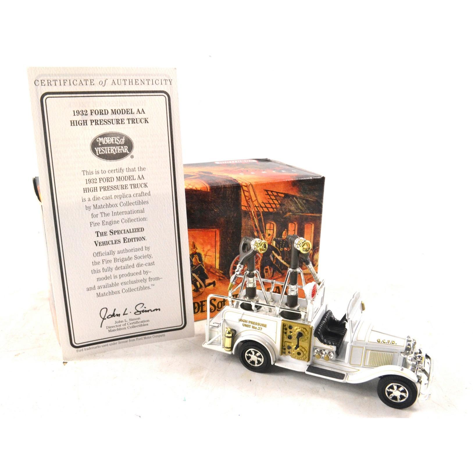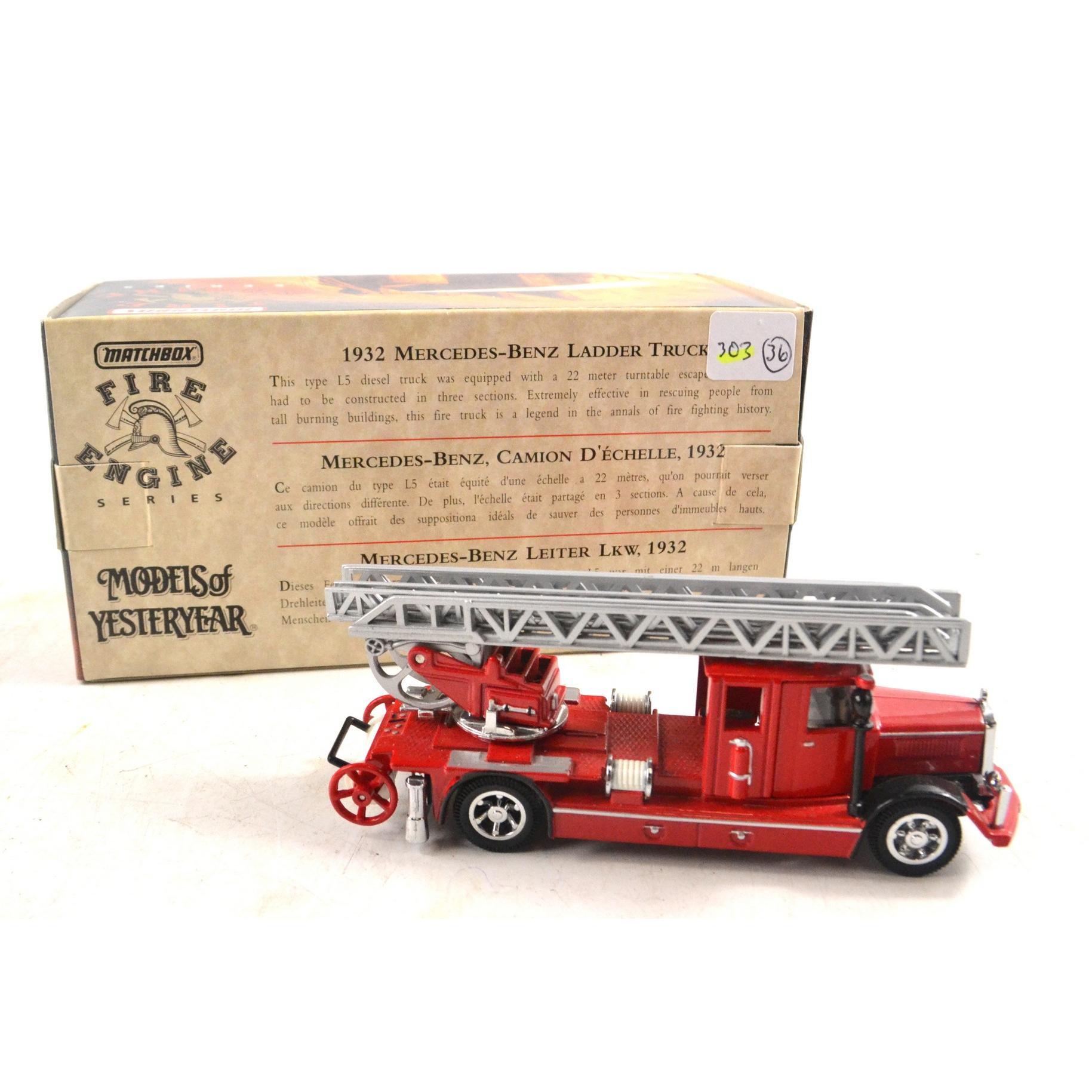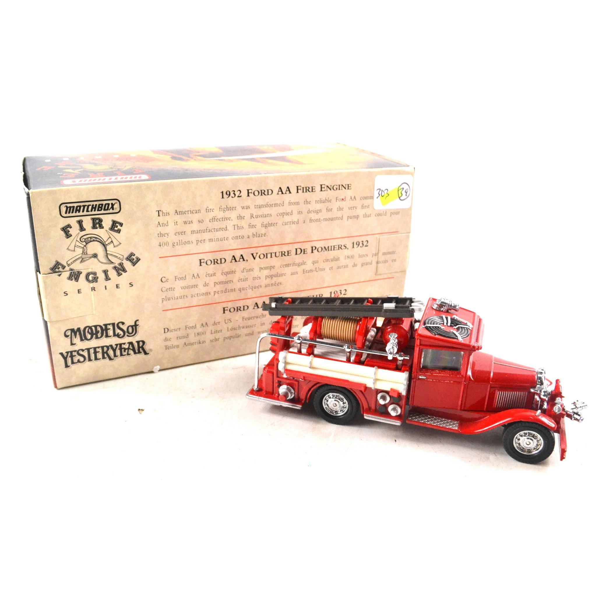 Selection of 5 matchbox models to include 1932 Mercedes Benz L5 Fire engine, 1948 GMC COE Fire Tanker/Pumper, 1932 Ford Open Cab Fire engine, 1932 Model AA High Pressure Fire truck and 1932 Ford AA Fire Engine