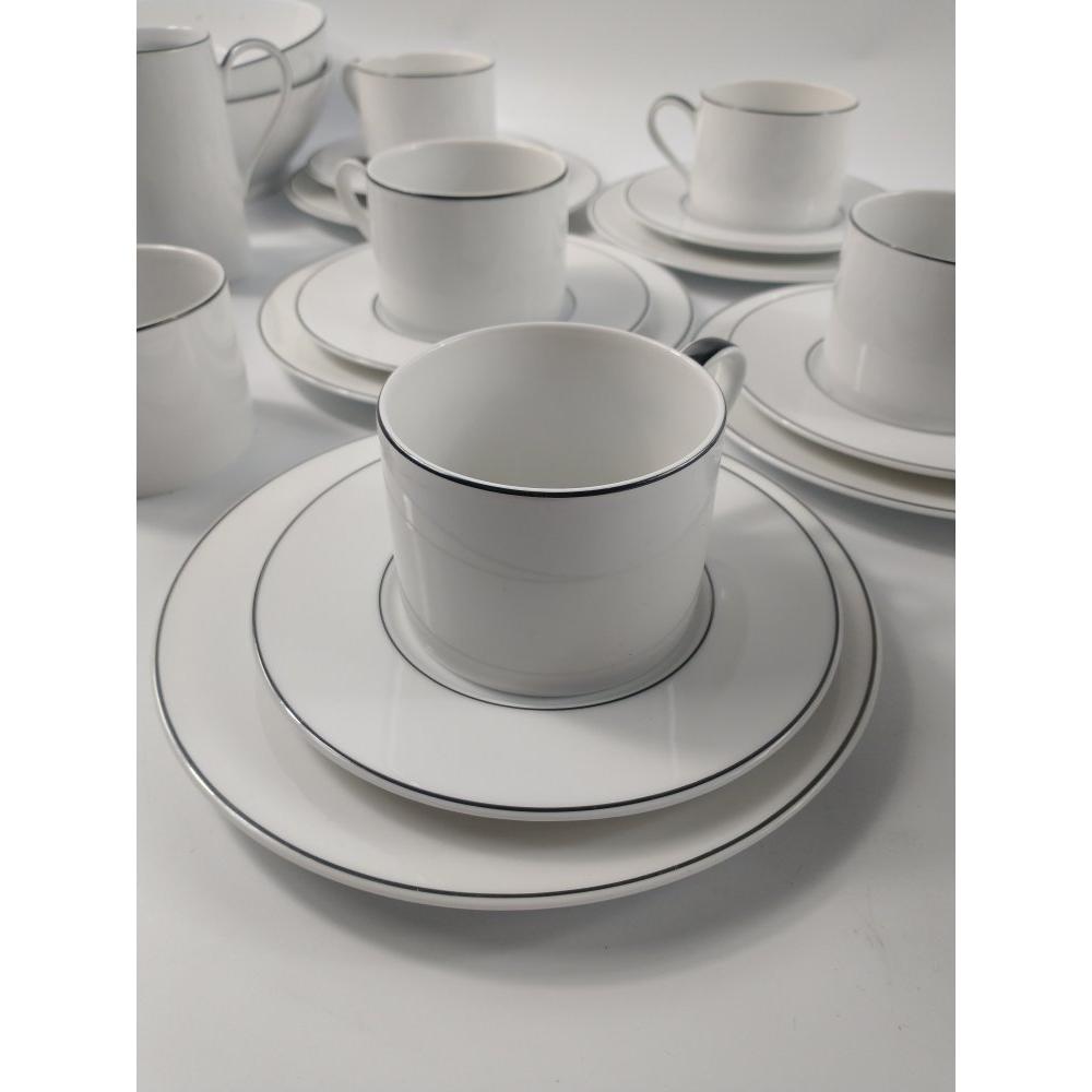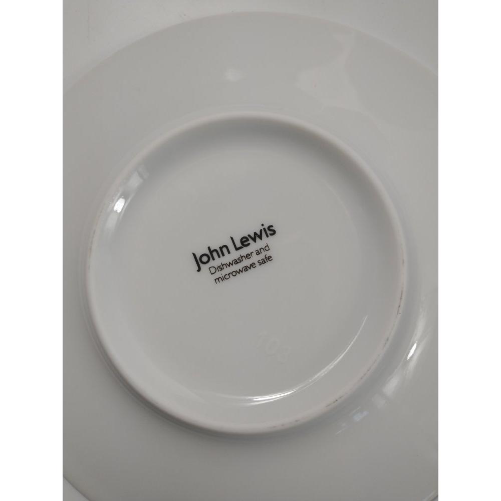 JOHN LEWIS dinner service, white with black acccent. Consists of 8 x dinner plates , 6 each of soup plates, side plates, saucers and teacups. 12 cereal bowls, one with slight crack. Also 2 serving bowls, 2 milk jugs and 1 teapot and 1 sugar bowl.