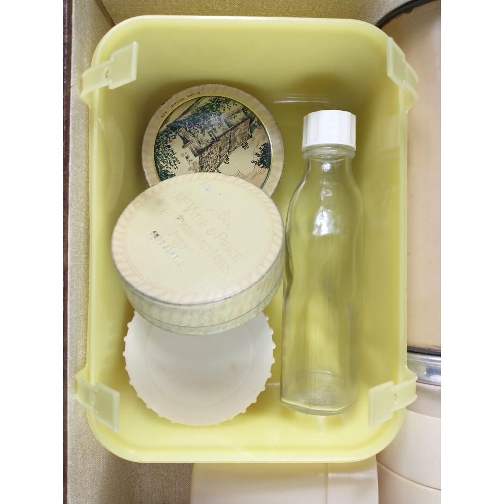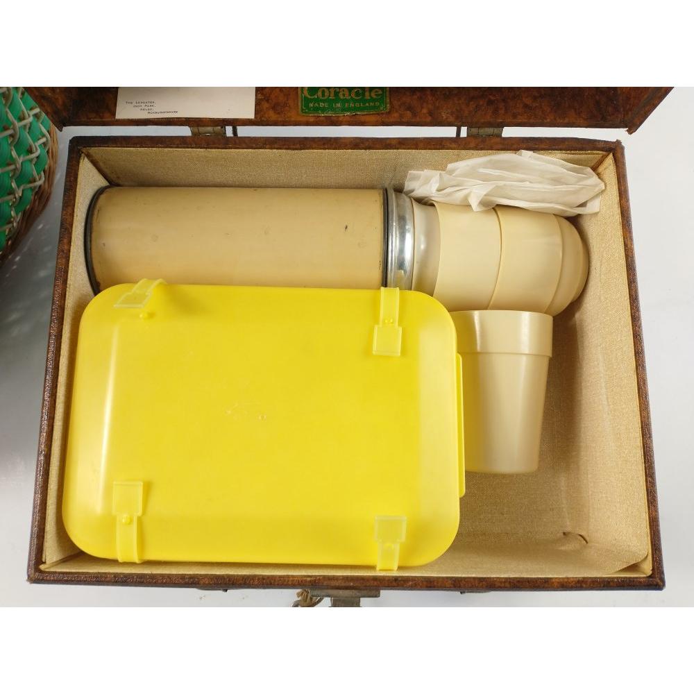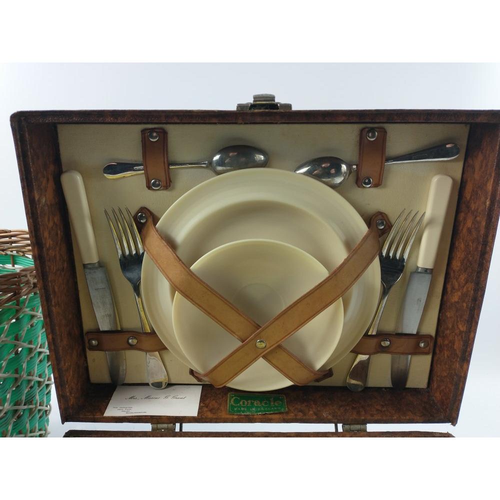 Vintage PICNIC SET for two 30 x 24cm. Smart carrying case complete withThermos flask and Coracle plates etc. plus 2 x McVities free sample tins with design of Burns Cottage. Also a shopping basket wicker/plastic 25cm high.