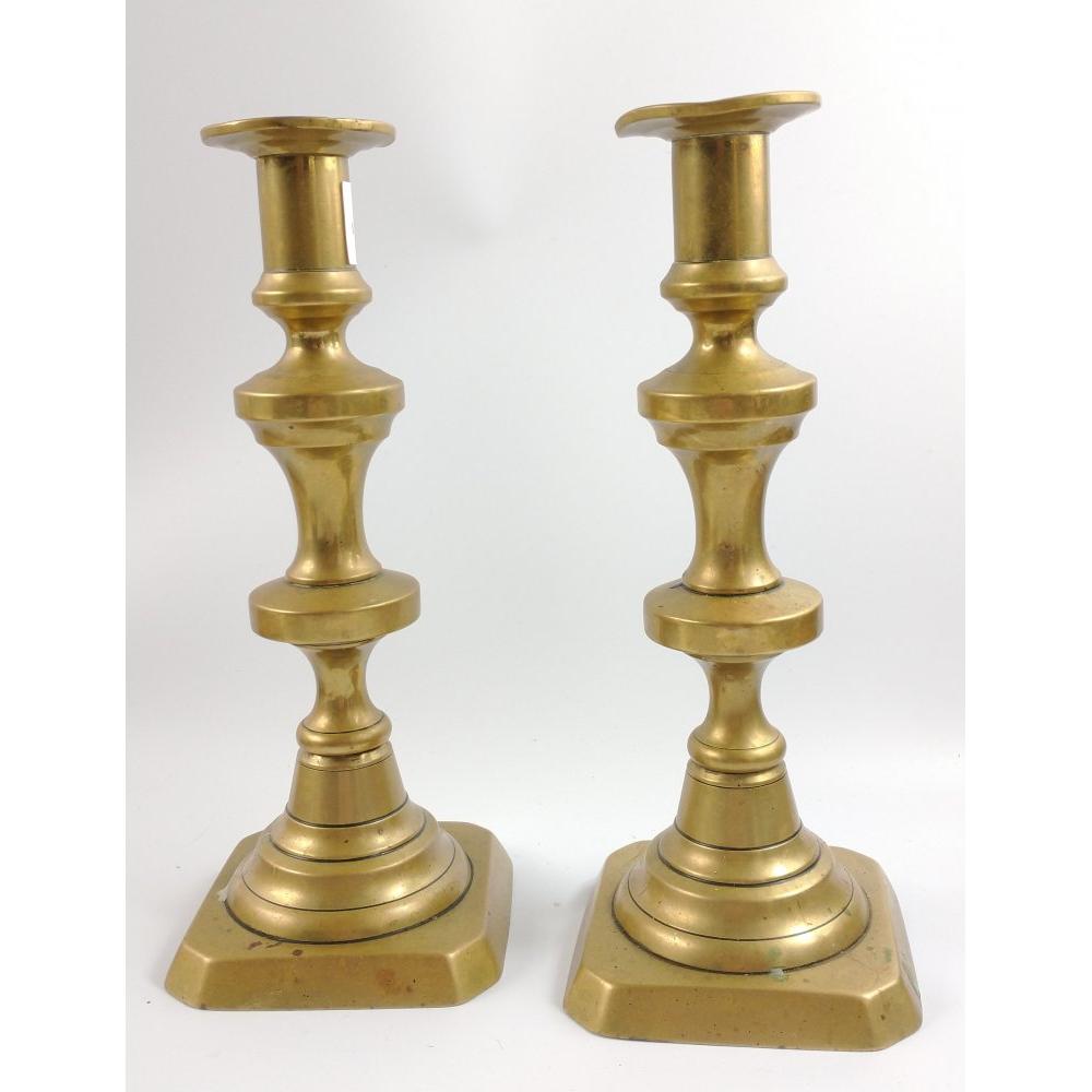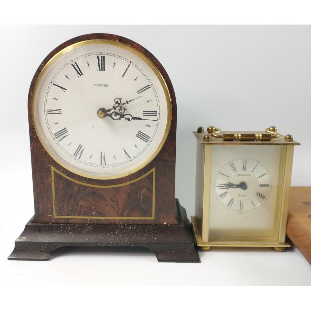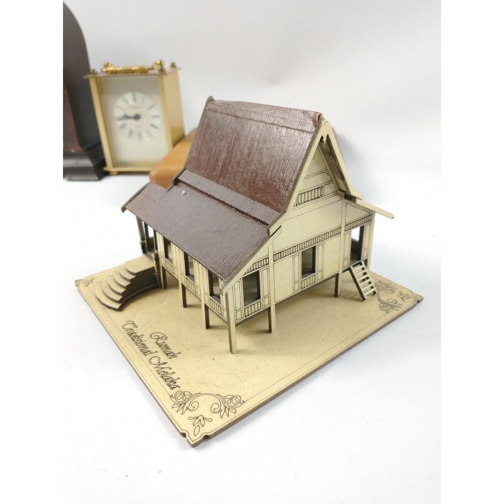 MIXED LOT of two clocks, one carriage, one wooden stamped Thos. R. Young plus 2 brass style candlesticks standing approx. 23cm high and a model of a traditional Malaysian home.Approx 6 pieces