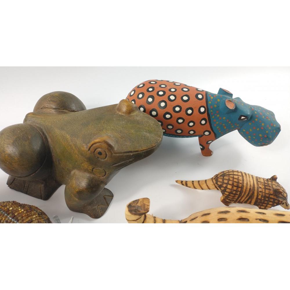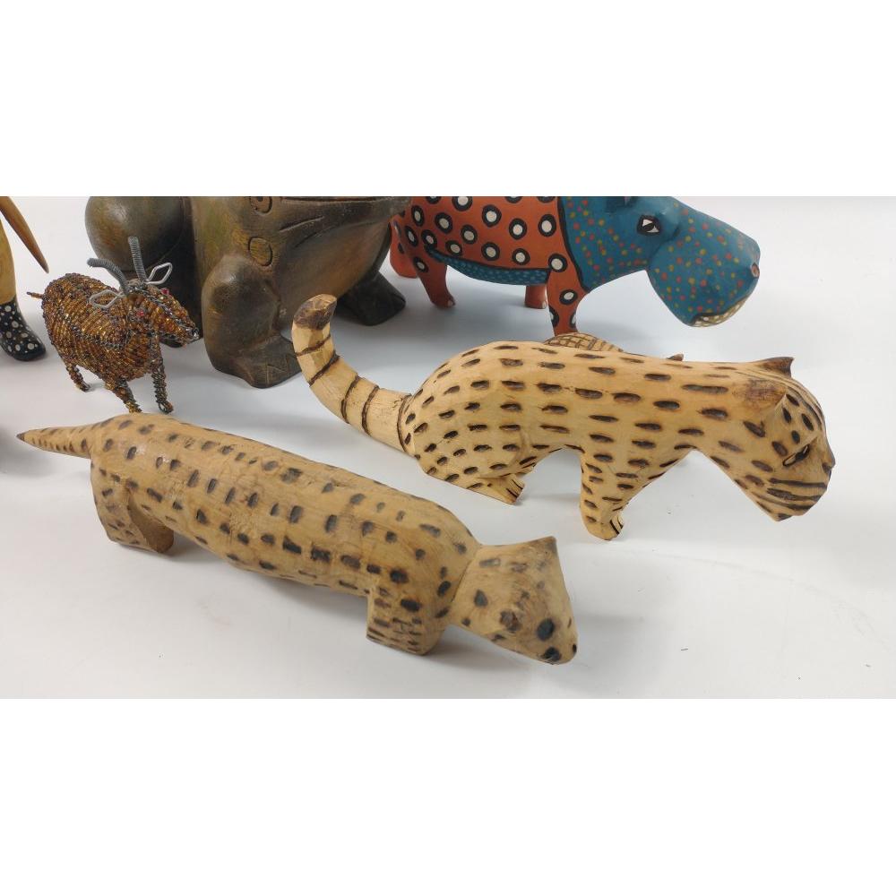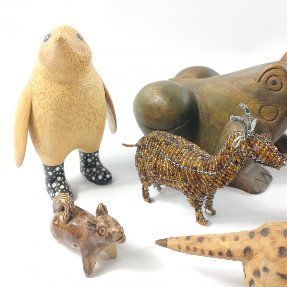 A mixed collection of STUDIO animals mainly WOODEN to include a penguin, tiger, a painted hippo and a large frog (20cm. approx.)Approx 8 pieces