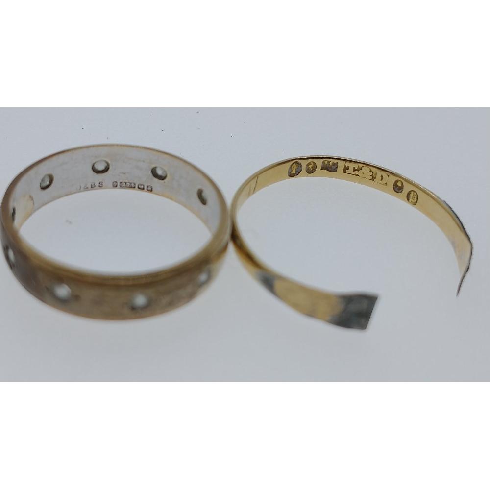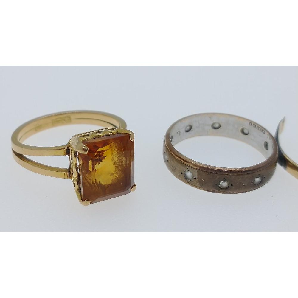 Selection of tested 9ct and hallmarked 18ct gold to include 9ct tested square cut orange stone size N approx 4.1g, 9ct tested white stone eternity ring size L approx 2.2g, 18ct hallmarked cut band approx 1g and signet face which appears to fit band approx 1.7g