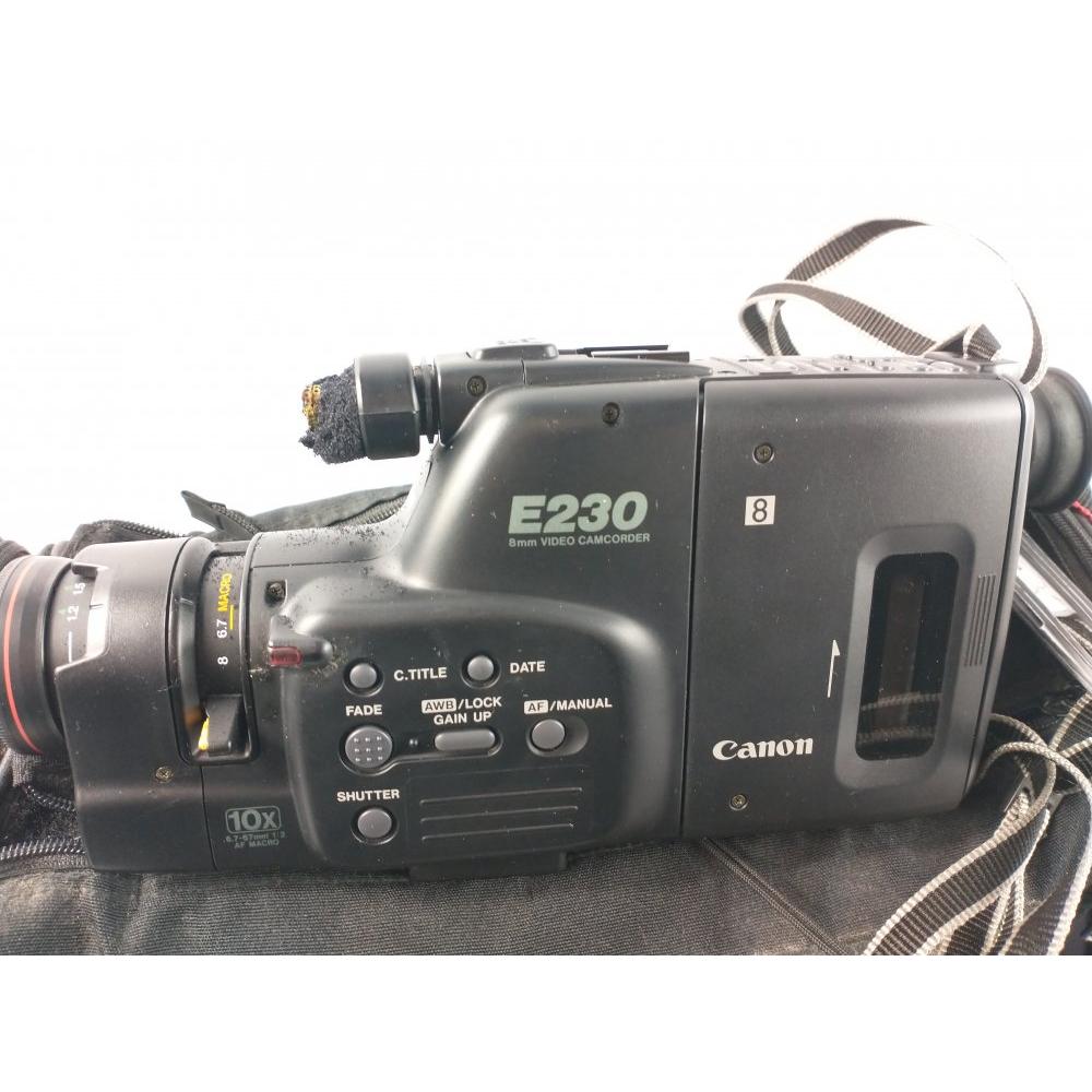 Vintage CANON E230 8mm video camera. Comes complete with battery charger, camera tripod etc. Microphone cover damaged.Approx 2 pieces