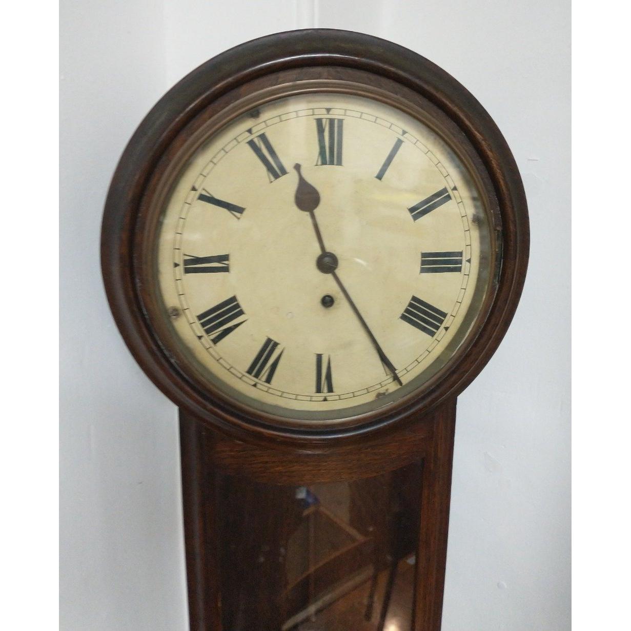 A large circa late Victorian wall clock with pendulum and key and a ROMAN NUMERAL dial in an oak case WE SHIP UK & WORLDWIDEW: 32cm approx H: 85cm approx