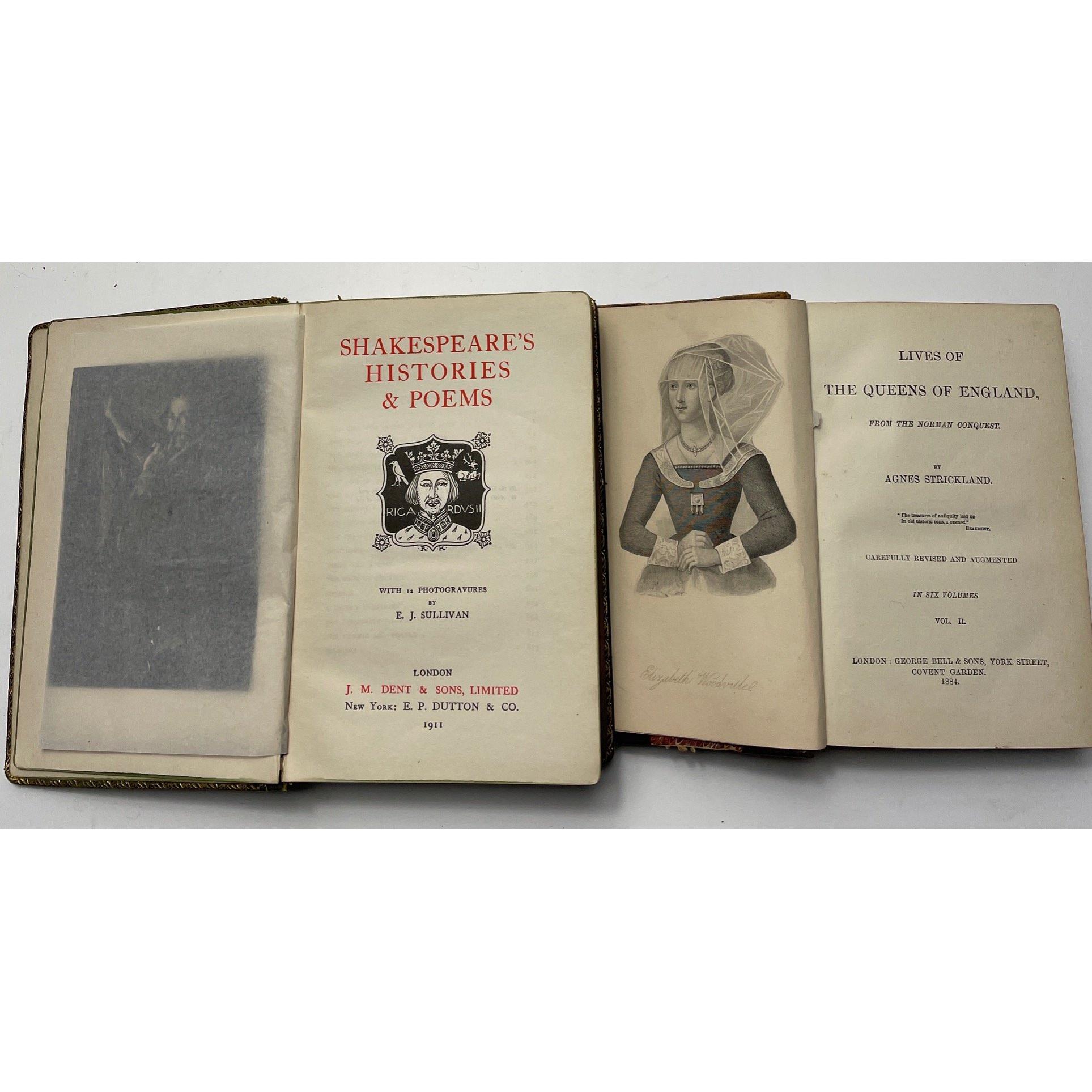 VINTAGE BOOKS to include THE WORKS OF SHAKESPEARE in 3 volumes (comedies, tragedies and histories), LIVES OF THE QUEENS OF ENGLAND in 6 volumes by Agnes Strickland revised ed. with marbled boards, lettered in gilt