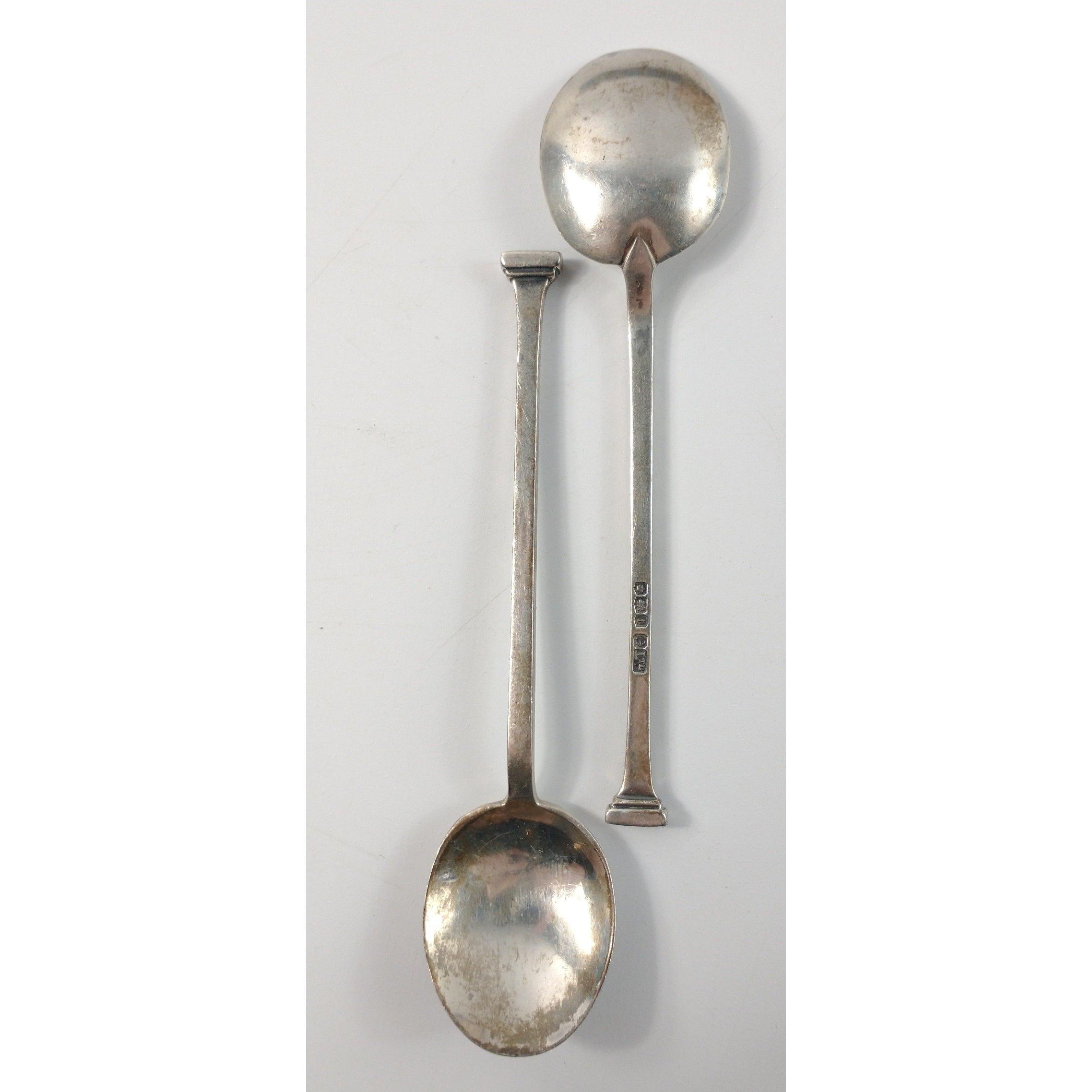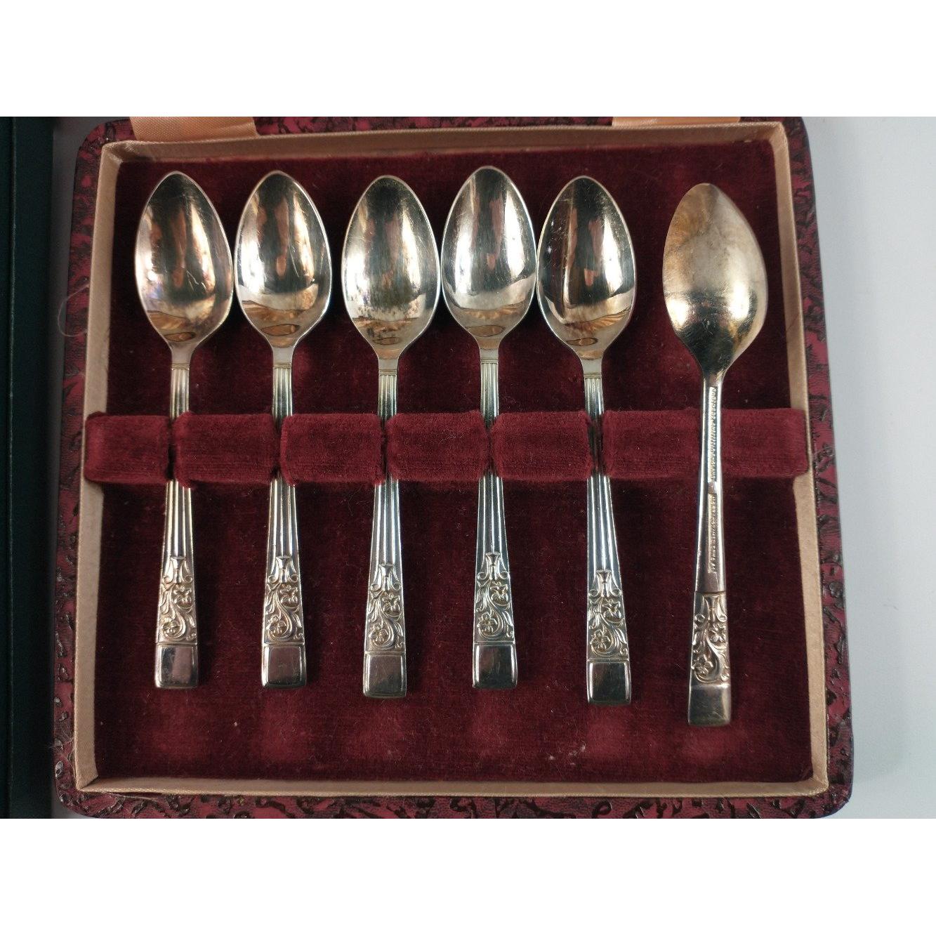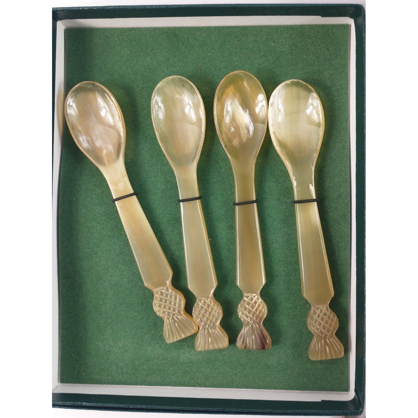 A set of five Sheffield Hallmarked silver teaspoons weight 49g approx, a presentation set of four ABBEYBURN Scottish Thistle handled horn teaspoons and a small vintage canteen of six EPNS teaspoons