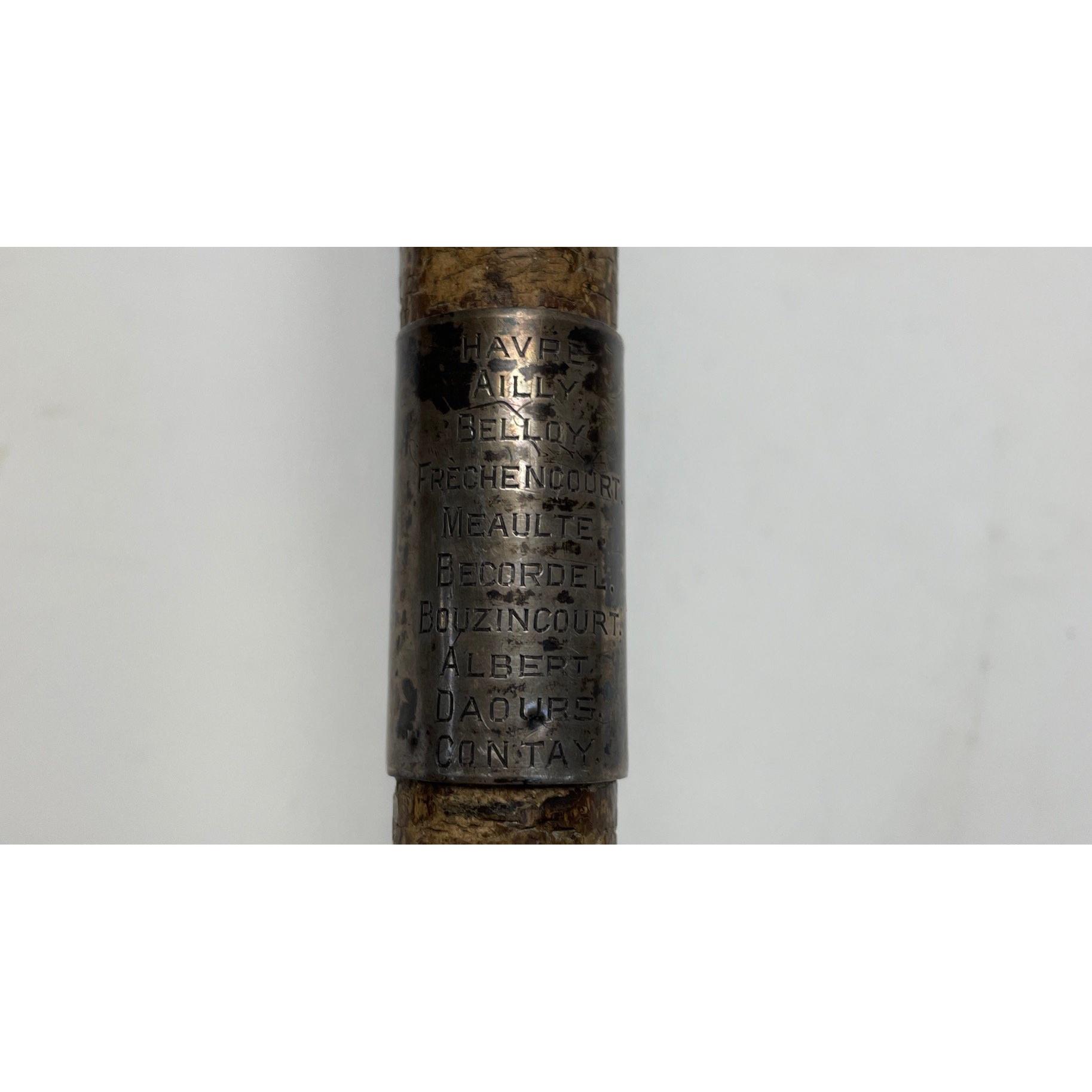 WW1 INTEREST! VERY INTERESTING & UNUSUAL! vintage RIDING CROP (?) approx. 50cm long with metal plate reading "HAVRE . AILLEY. BELLOY . FRECHENCOURT . MEAULTE . BECORDEL . BOUZINCOURT . ALBERT . DAOURS . CONTAY" each of which is a military cemetry in France.