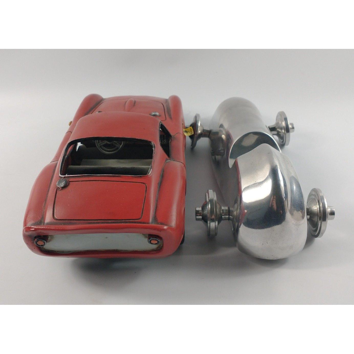 Collectable VINTAGE STYLE MODEL CARS. Aluminium (?) racing car approx. 33cm long and a well-loved Ferrari approx. 35cm longApprox 2 pieces