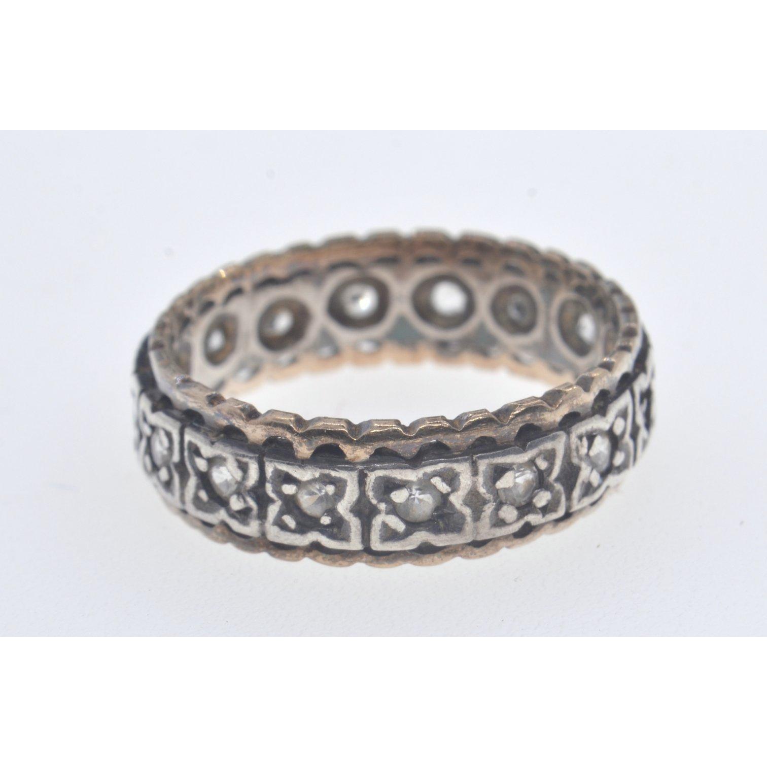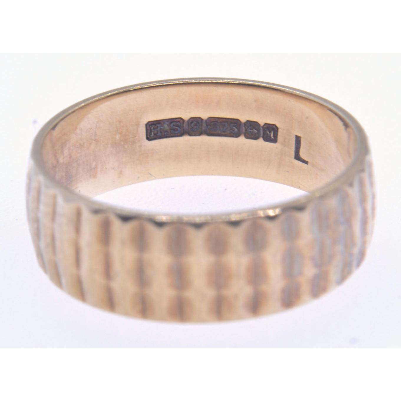 A nice 375 stamped yellow gold wedding band size L weight 3g weight with also an unusual vintage decorative ladies ring with white stones encircling the two bands of white and yellow metal ring size L weight 2.35g