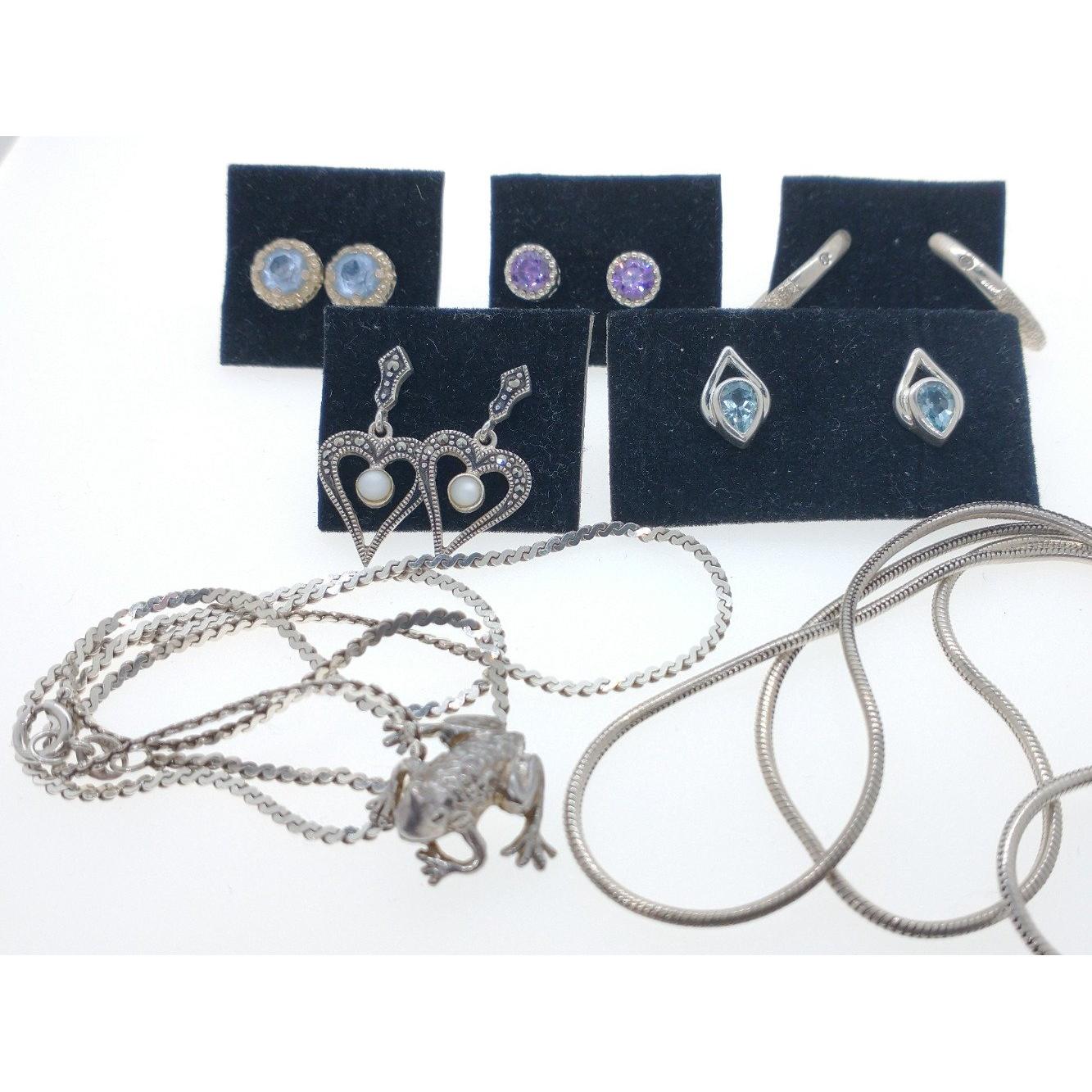 Collection of 925 stamped jewellery to include pair of purple stone stud earrings, pale blue stud earrings, pear shaped pale blue/green stud earrings, heart shaped set with opaque stone earrings, drop earrings, white metal frog pendant with 925 chain and a white metal snake style necklace