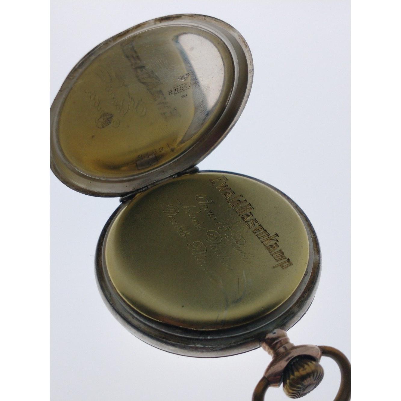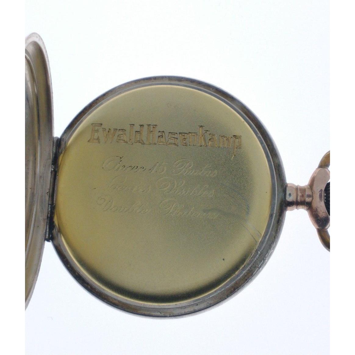 800 stamped gents gilded silver winding pocket watch with second dial. Back case stamped R 0,800 and 248917. Engraved with Ewald Hasenkamp. Movement not named. Has oval motif on back, scrolled hands