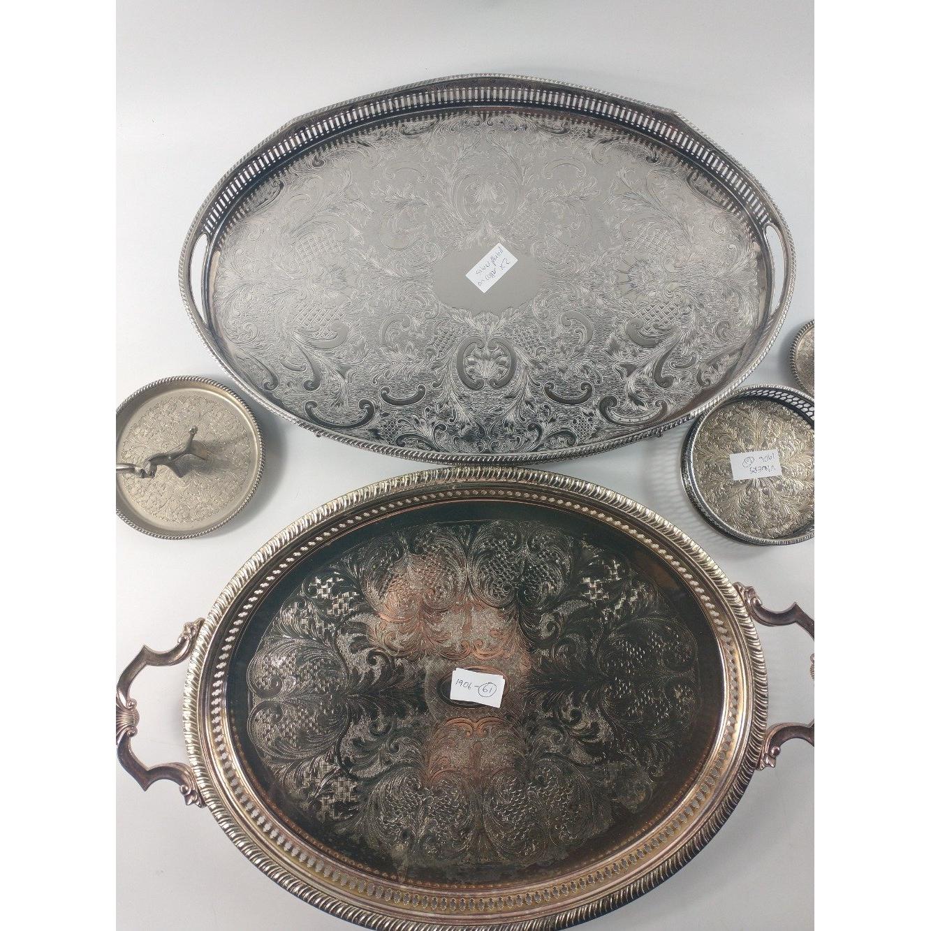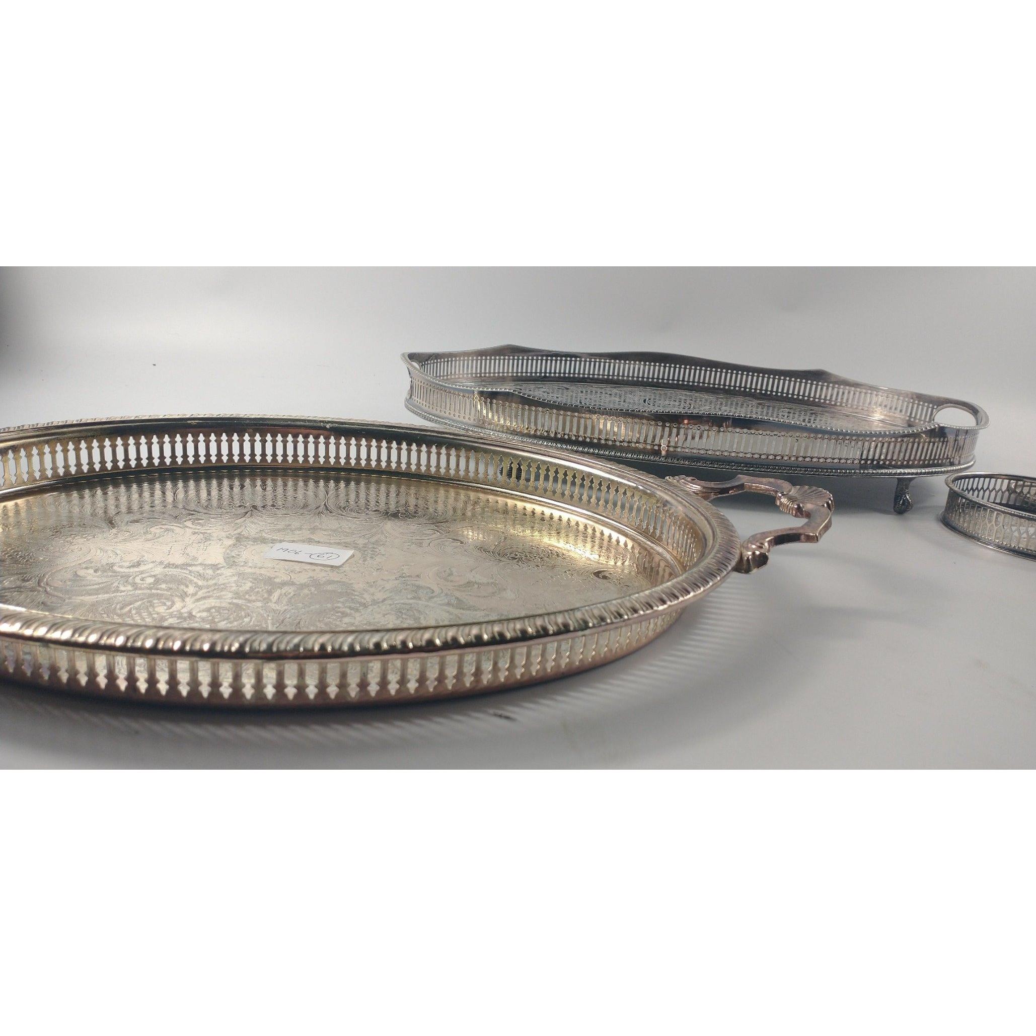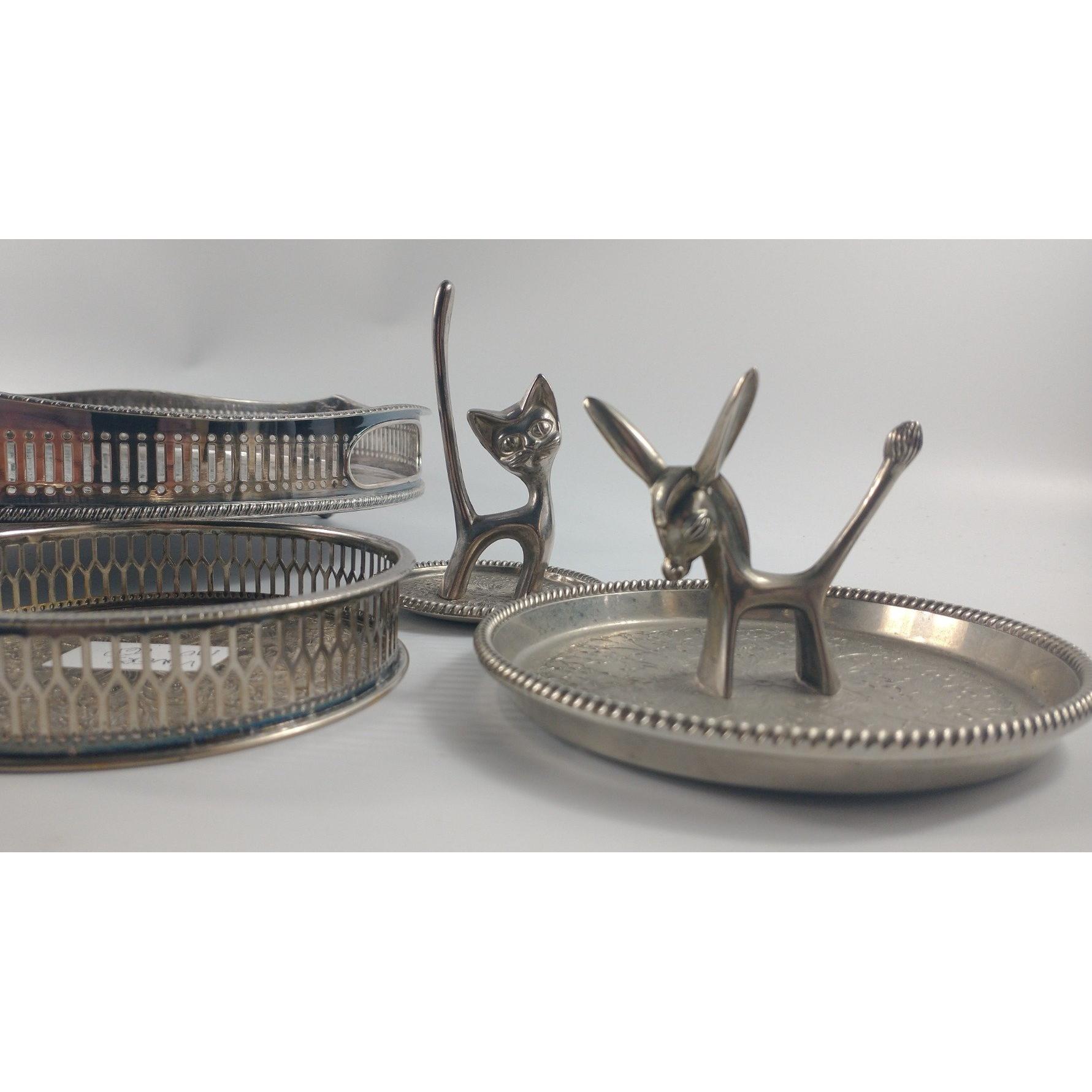 A nice metallic collection SILVER PLATE over COPPER tray approx. 45cm long, a second tray approx. 42cm, plus 2 SEBA Vintage SILVER PLATE over BRASS ring dishes one with a donkey and the other, smaller, with a cat and a VINERS vintage wine bottle coaster