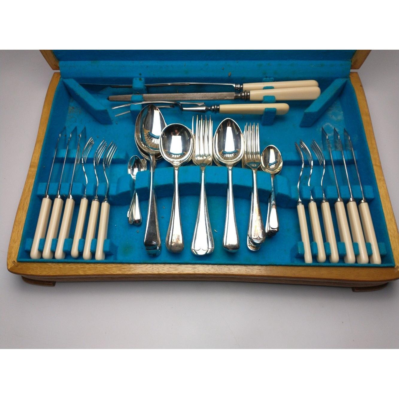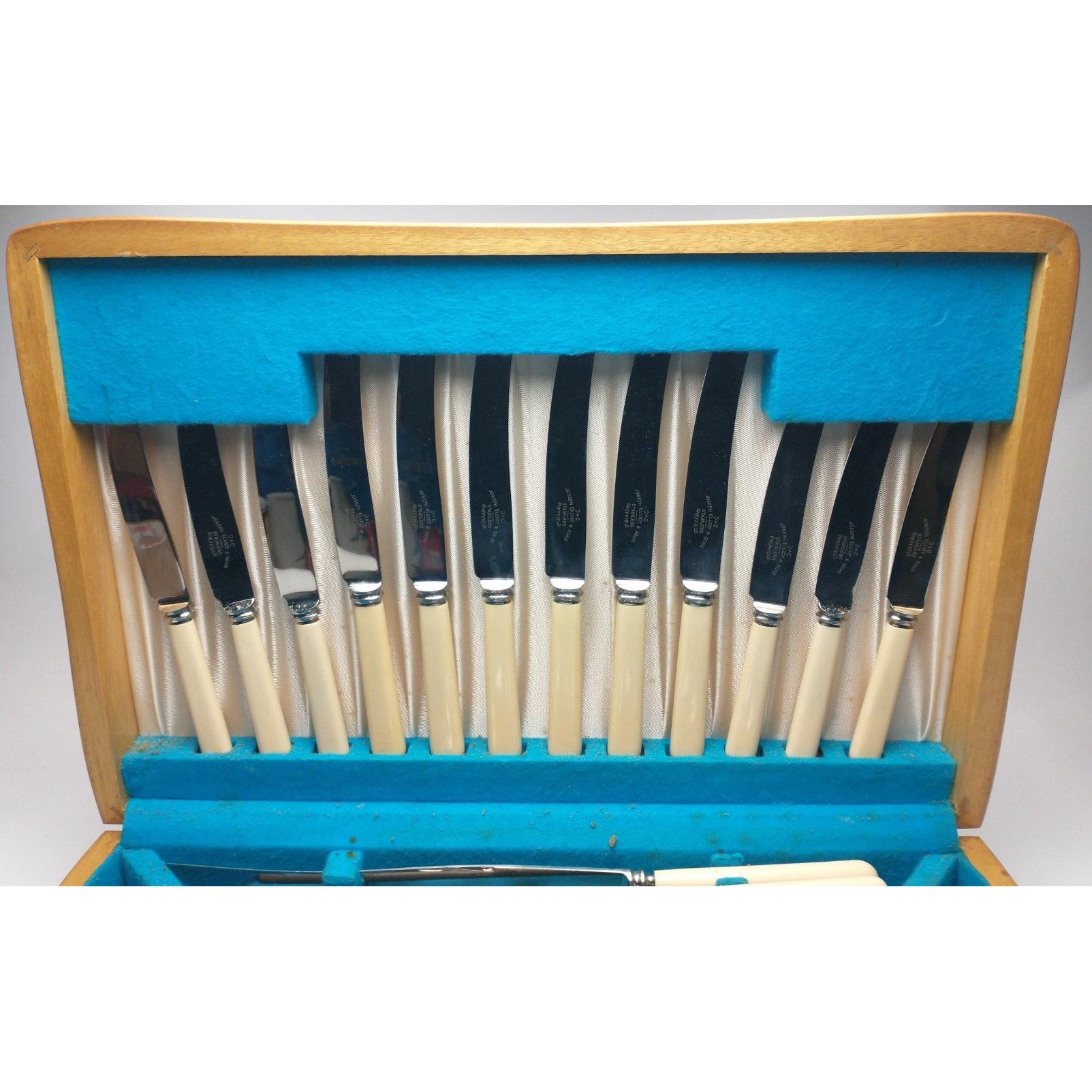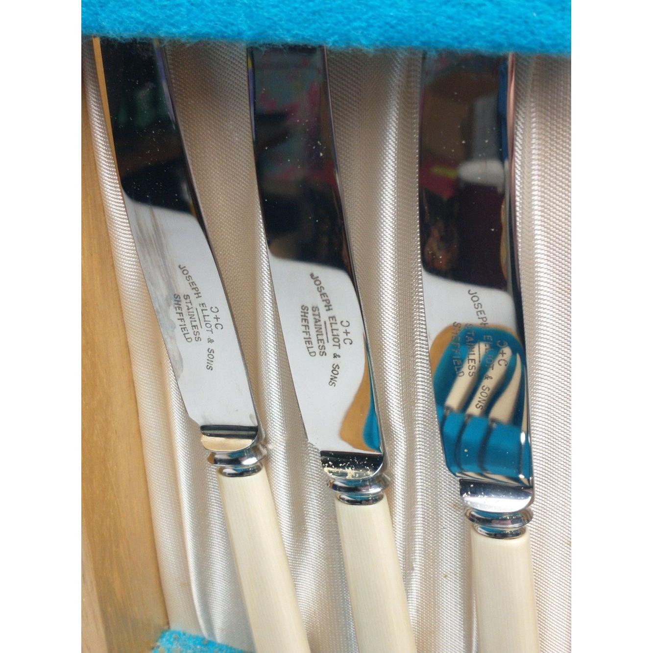 Joseph Elliot & sons of Sheffield wooden cased canteen of cutlery with sets of 6 main course knife, and forks, 6 dessert spoons, 6 soup spoons, 6 each of tea spoon and mini spoons, 6 each of fish knife and fork, 4 serving spoons and full carving set!