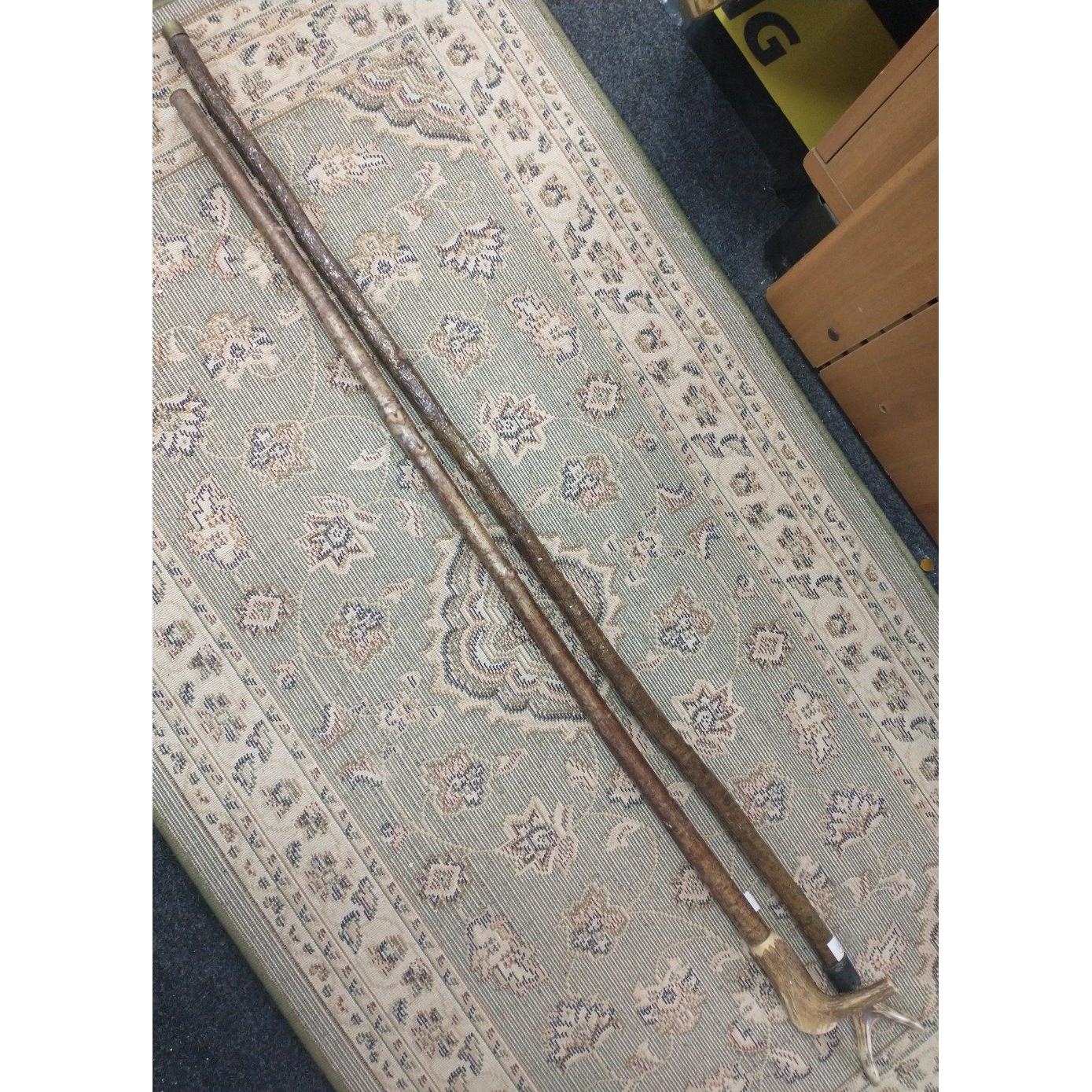 Two SCOTTISH handmade horn-handled hiking/stalking sticks - look tremendous in any hallway stick stand! Length of the largest stick 130cm WE SHIP UK AND WORLDWIDEApprox 2 pieces